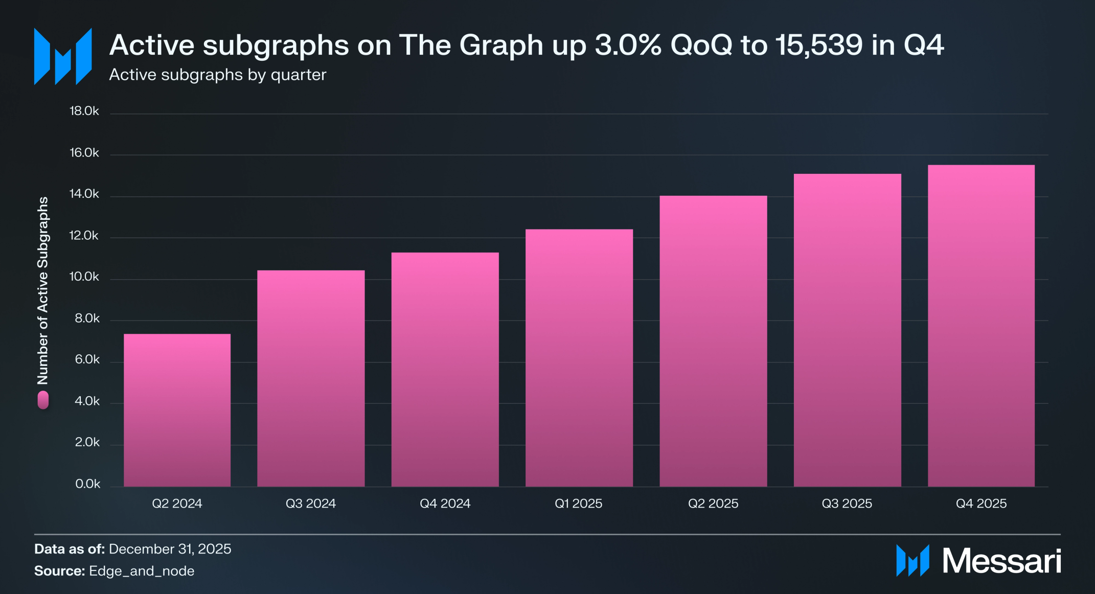더 그래프 탈중앙화 네트워크의 활성 서브그래프 성장은 2025년 Q4에도 이어지며 7분기 연속 확대를 기록했다. 활성 서브그래프 수는 Q3의 15,087개에서 3.0% QoQ 증가한 15,539개를 기록하며 역대 최고치를 세웠다. 성장 속도는 이전 분기에 비해 둔화됐지만, 지속적인 증가세는 어려운 시장 환경에도 개발자 참여가 꾸준함을 시사한다.