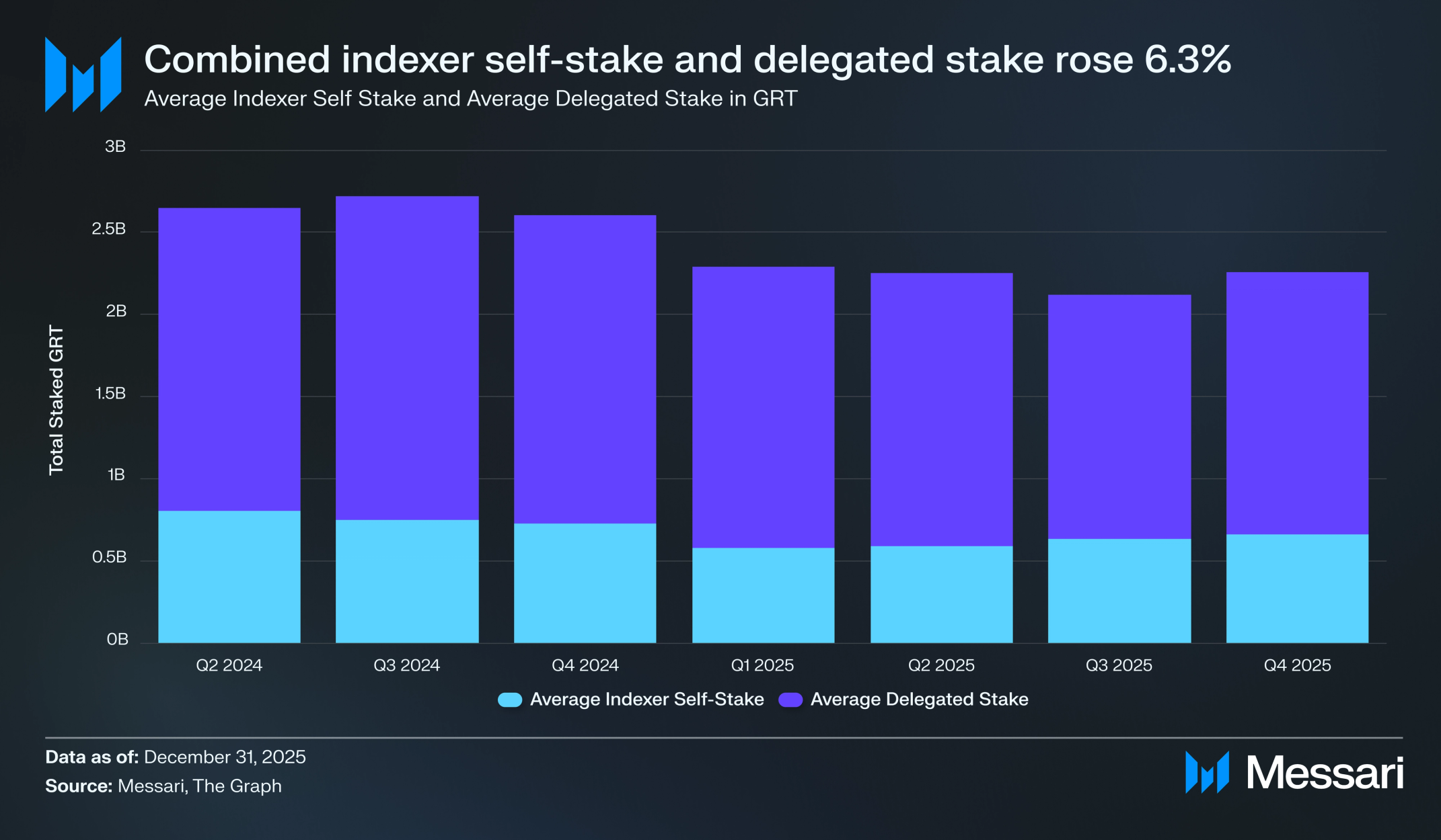 더 그래프의 스테이킹 역학은 2025년 Q4에 안정화됐으며, 연초 이후 감소세 이후 인덱서 자기 스테이크와 위임 스테이크 모두 소폭 증가했다. 평균 인덱서 자기 스테이크는 Q3의 6억 3,350만 GRT에서 3.9% QoQ 상승한 6억 5,830만 GRT를 기록했다. 이 증가는 토큰 가격이 계속 압박을 받는 상황에서도 운영자들 사이에서 신뢰가 회복됐음을 시사한다.