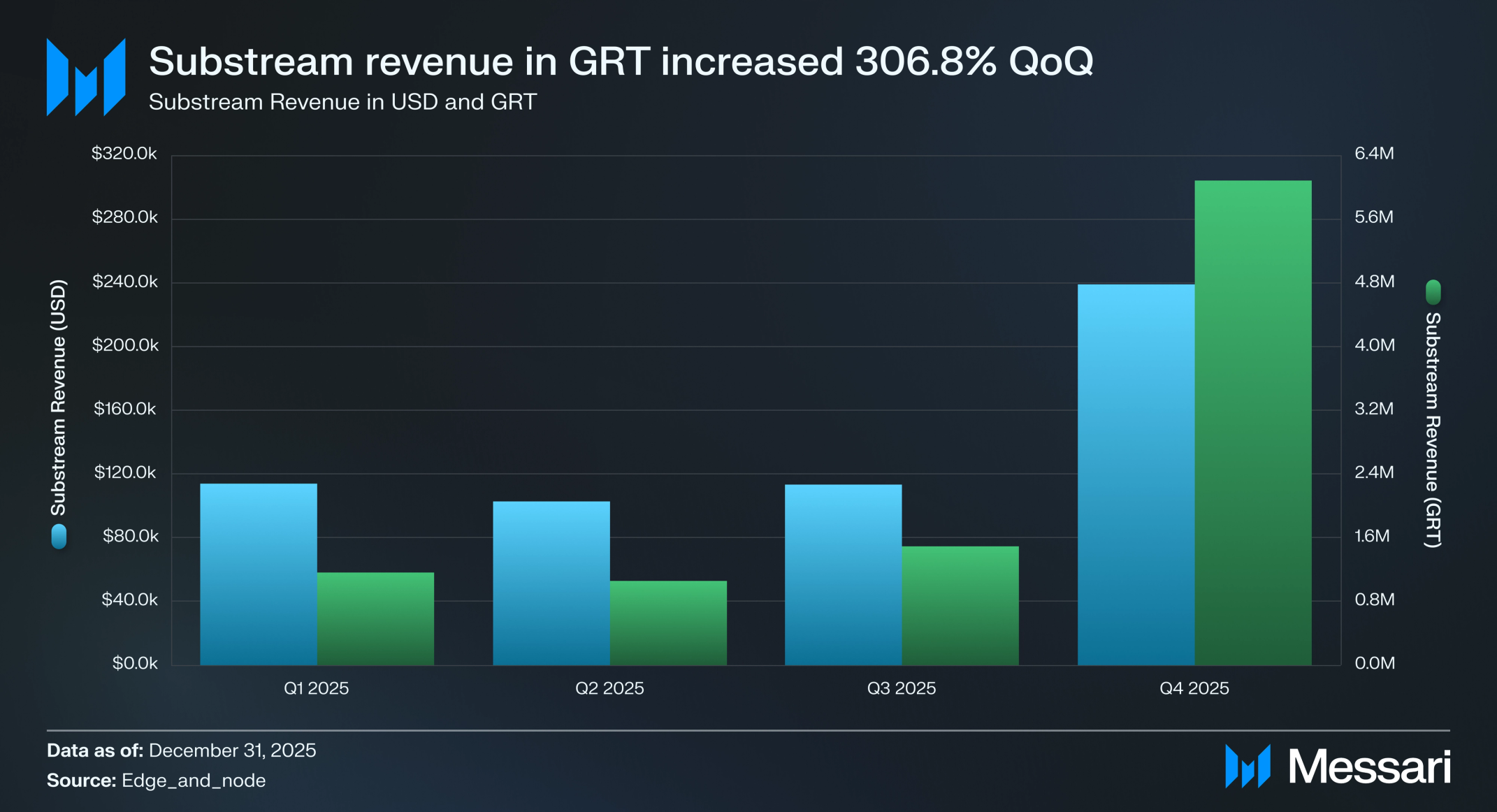 전체적으로 Q4는 서브스트림에 있어 돌파구적인 분기였다. GRT 및 USD 기준 수익 모두의 급격한 상승은 개발자 채택 가속화와 프로덕션 사용 사례 확대를 시사한다. 서브스트림은 더 그래프의 네트워크 사용 수수료에 있어 중요한 기여자로 점차 부상하고 있으며, 기존 서브그래프 쿼리를 넘어 프로토콜의 수익 구성을 강화하고 있다.