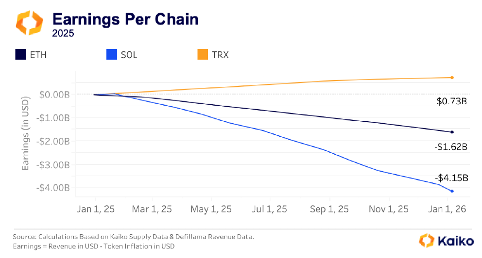누적 인플레이션 차트는 이 비용의 영속성을 재확인시켜준다. 각각의 베스팅(vesting) 기간이 시작된 이후, 이더리움은 가치 기준으로 170억 달러 이상, 솔라나는 100억 달러 이상을 누적 인플레이션으로 기록했으며, 두 체인 모두 수익과 무관하게 검증인 발행을 통해 매년 수십억 달러씩 계속 추가하고 있다. 2025년 수익 데이터는 이것이 연중 지속적인 손실로 이어졌음을 보여주며, 어느 체인도 이전의 활동 고조 구간에도 불구하고 손익분기점에 근접하지 못했다.