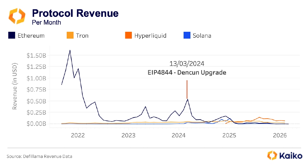 덴쿤 이후의 붕괴는 이 상황을 더욱 악화시켰다. L2 네트워크들이 고비용의 콜데이터(calldata) 대신 최소한의 블롭 수수료를 납부하기 시작하면서 일일 수수료가 2,500만 달러에서 약 100만 달러로 하락했다. 이로 인해 수수료 소각이 98% 급감했고, 발행과 소각 간 격차가 손익분기점 근접 수준에서 지속적인 연간 손실로 벌어졌다.