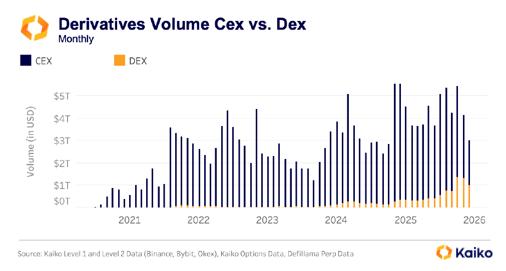 탈중앙화 파생상품 거래의 부상은 하이퍼리퀴드의 제로 인플레이션 모델을 실현 가능하게 만드는 수익 기반을 창출했다. DEX(탈중앙화 거래소) 무기한 선물 거래량은 2023년 1월 CEX(중앙화 거래소) 거래량의 2.1%에서 2025년 11월에는 11.7%로 성장했으며, 2025년 12월에는 시장이 3개월 연속으로 월간 거래량 1조 달러를 돌파하면서 22%에 달했다. 이는 전년 대비 10배 증가에 해당하며, 2025년 한 해에만 DEX 무기한 선물 거래량이 7조 달러를 초과했다.