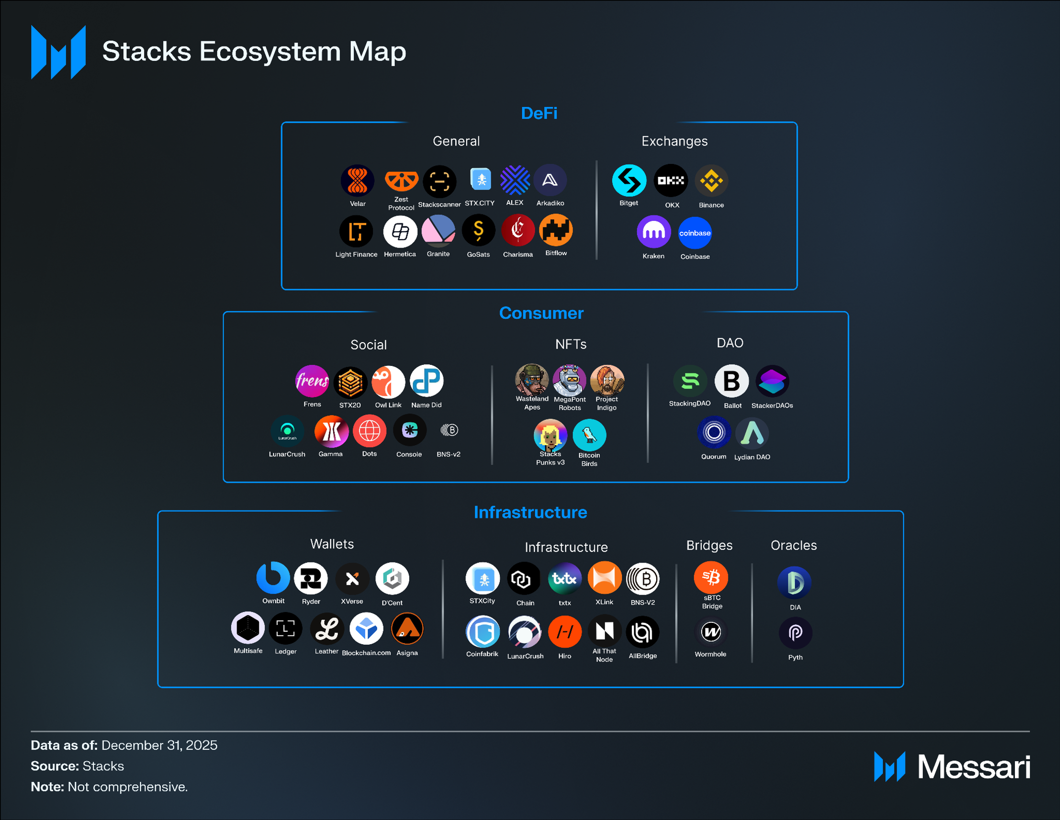 • 클래리티 4(Clarity 4)가 Q4에 활성화되어 네트워크 처리량이 개선되었으며, 현재 전체 블록의 95.7%가 5초 이내에 도착하고 약 ⅓은 2초 미만에 확정된다. 이번 업그레이드는 2026년 중 예정된 제품 출시를 위한 스택스 네트워크의 준비 작업이다.