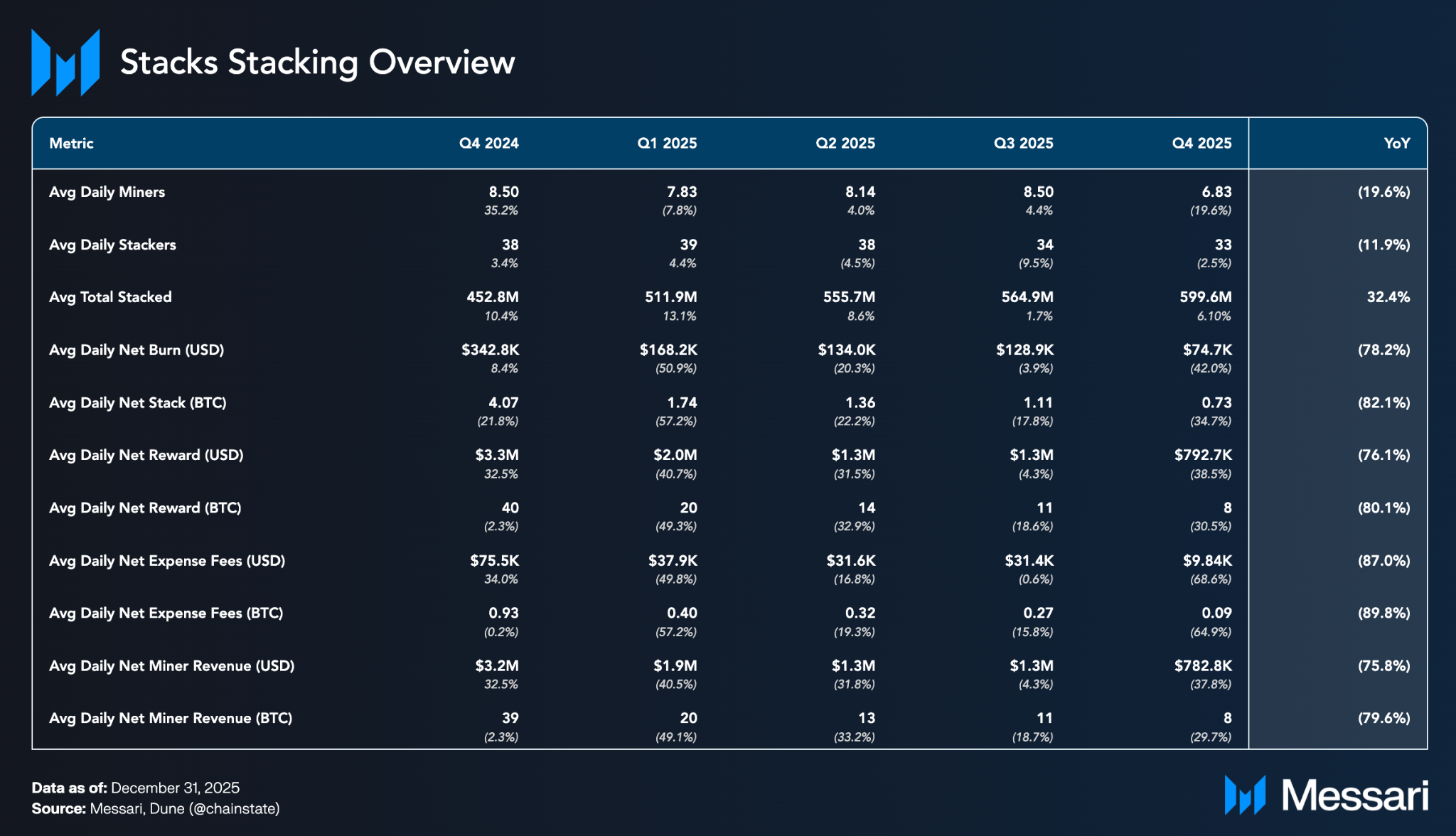 Q4에도 스태킹 풀 지배가 지속되어 고유 사용자 참여에 대한 가시성이 계속 낮았다. 다만 자본 커밋 추이는 보다 측정 가능했다. Q4 스태킹에 잠긴 평균 총 STX는 QoQ 6.1% 증가해 5억 9,960만 STX를 기록하며 4분기 연속 성장세를 이어갔다. 이는 Q4 2024의 4억 5,280만 STX 대비 YoY 32.4% 증가로, 거시 불확실성 속에서도 기관 또는 고액 자산가 참여가 지속되고 있음을 보여준다. 반면 일평균 스태커 수는 QoQ 2.5% 감소해 33명을 기록하며 나카모토 업그레이드 이후 최저치를 나타냈고, YoY로는 11.9% 줄었다. 이 괴리는 더 적은 참여자가 더 많은 자본을 잠그는 자본 집중화 현상을 시사한다. 한편 일평균 채굴자 수는 QoQ 19.6% 감소해 6.8명으로, YoY 역시 19.6% 줄어 2024년 초 이후 최저 수준으로 한 해를 마감했다.