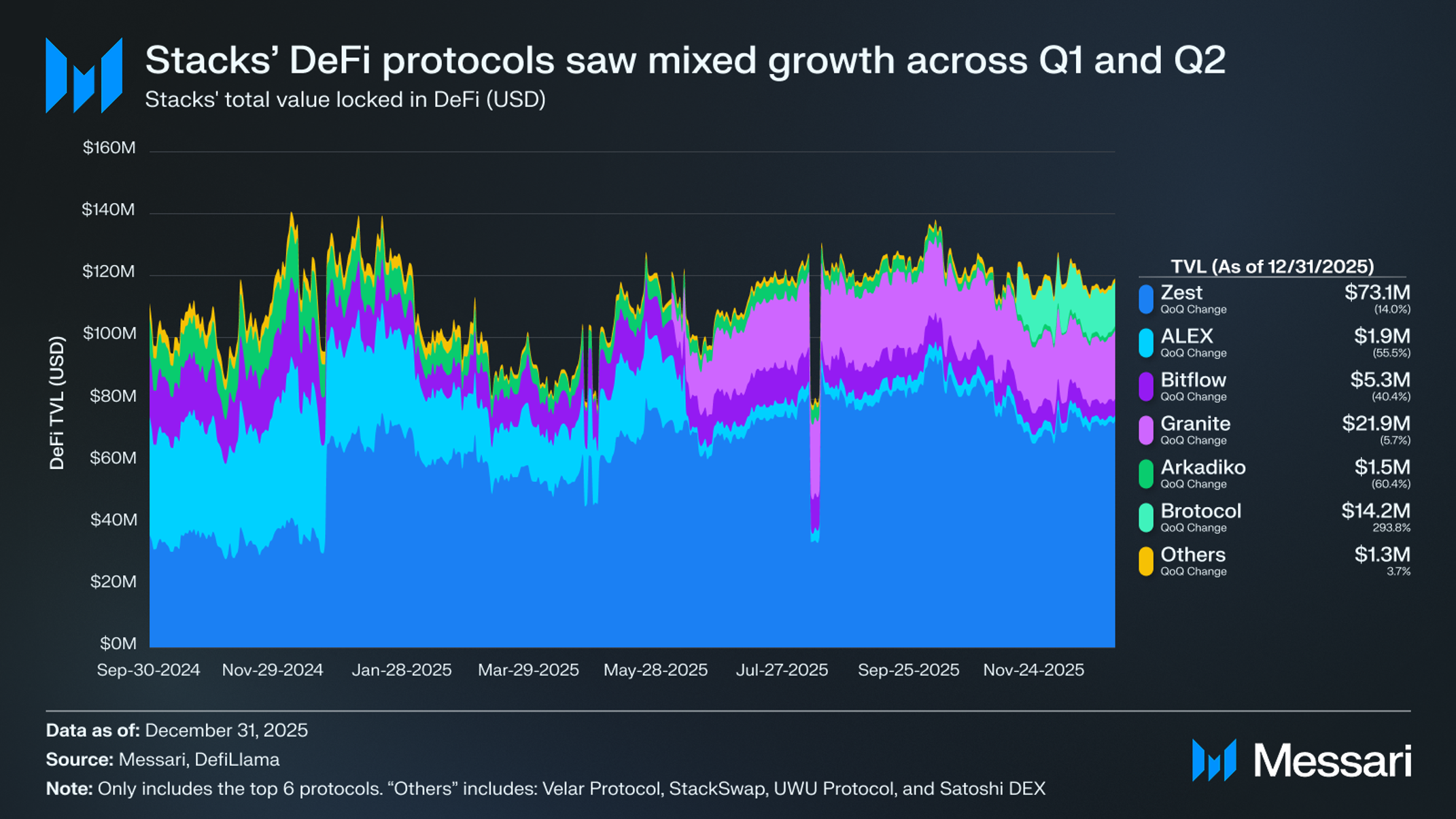USD 기준 하락에도 불구하고, STX 및 BTC 가격 하락에 따른 것으로, 대부분의 프로토콜은 네이티브 STX 기준 TVL이 안정적이거나 증가했다. 제스트는 Q4 말 7,310만 달러로 스택스 내 TVL 1위 DeFi 프로토콜 자리를 유지했으며, USD 기준으로는 Q3의 8,500만 달러에서 14.0% 감소했지만 BTC 기준으로는 계속 성장해 지속적이고 증가하는 자본 유입을 반영했다. 알렉스(ALEX)는 상반기 익스플로잇의 여파로 QoQ 55.5% 추가 하락해 190만 달러를 기록, YoY 93.9% 하락하며 사용자 신뢰 회복이 요원함을 보였다. 비트플로우(Bitflow)는 QoQ 40.4% 하락해 530만 달러가 되었지만 STX 기준으로는 여전히 상승했다. 그래닛(Granite)은 소폭 5.7% 감소한 2,190만 달러로 안정세를 유지하며 핵심 유동성 거점으로서의 입지를 이어갔다. 아르카디코(Arkadiko)는 다분기 하락세를 연장해 Q3 TVL의 60.4%를 잃고 150만 달러로 마감했으며, 이는 YoY 83.3% 하락에 해당한다. 가장 두드러진 것은 엑스링크(XLink)(브로토콜(Brotocol)로 리브랜딩)로, 360만 달러에서 1,420만 달러로 QoQ 293.8% 증가했다. 스택스왑(StackSwap), UWU 프로토콜(UWU Protocol), 사토시덱스(SatoshiDEX) 등을 포함하는 '기타' 소규모 프로토콜들은 QoQ 3.7% 성장해 합산 130만 달러를 기록했지만, 생태계 DeFi 활동에서의 비중은 여전히 미미하다.