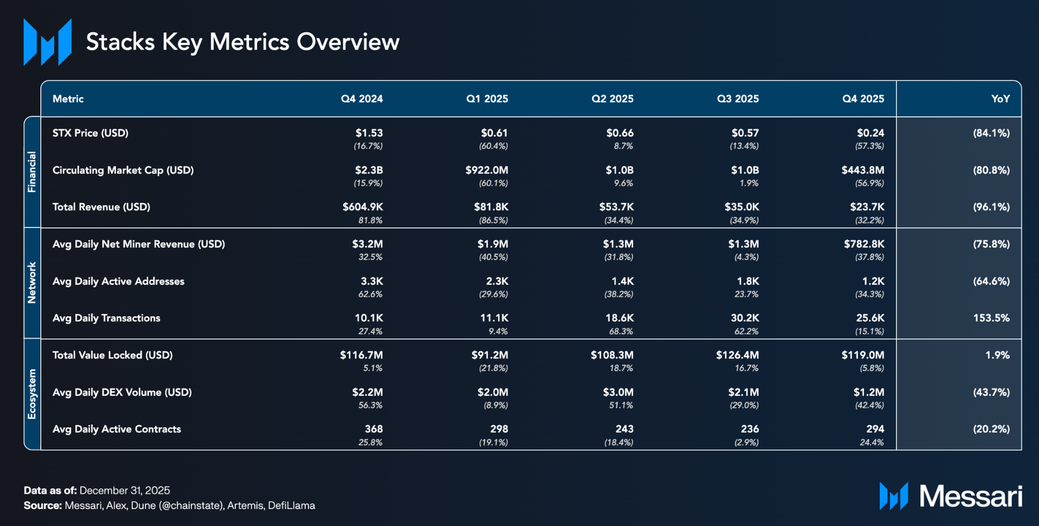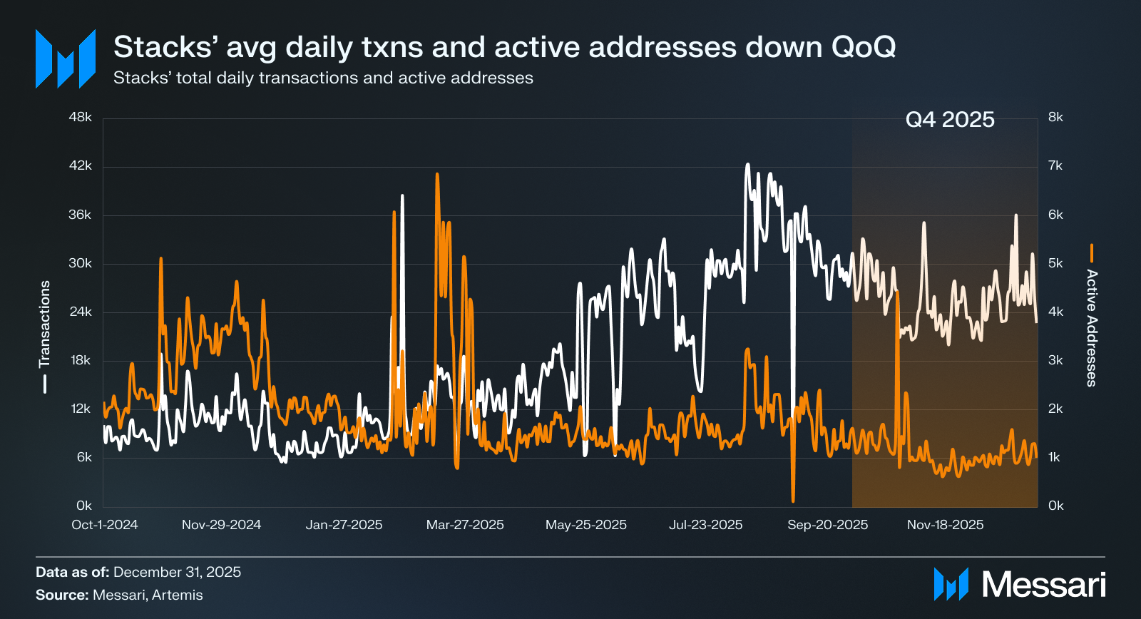 스택스의 프로토콜 수익은 Q4에도 감소세를 이어가며 QoQ 32.2% 하락, 34,956달러에서 23,701달러로 줄었으며, 60만 4,000달러를 넘었던 Q4 2024 최고점 대비 전년 동기 대비로는 96.1% 하락했다. 이 지속적인 수축은 트랜잭션 수요 감소와 낮아진 STX 가격을 반영한다.
