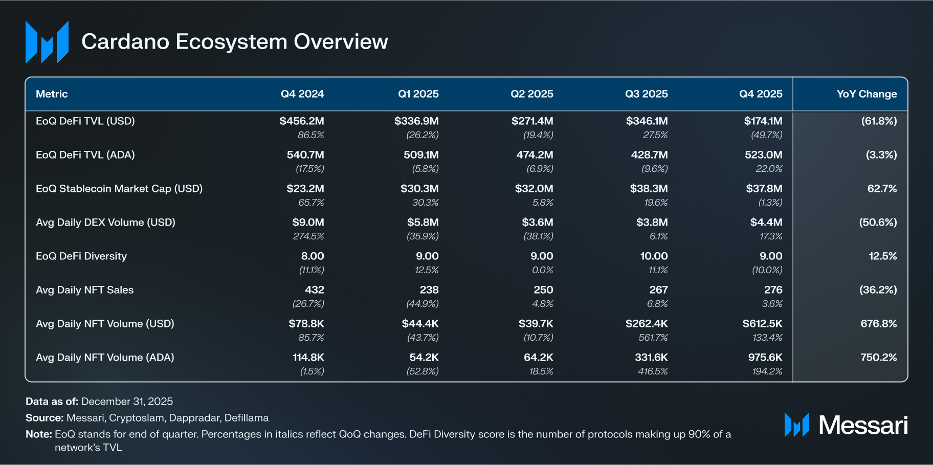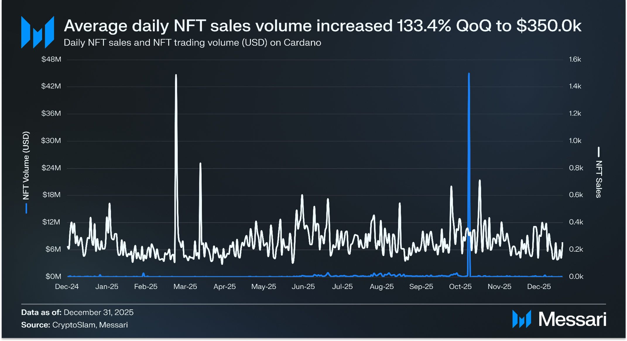 카르다노의 일평균 NFT 판매 건수는 4분기에 전분기 대비 3.6% 증가한 276.1건을 기록했으며, 달러 기준 일평균 거래량은 133.4% 증가한 61만 2,454 달러를 기록했다. jpg.store는 거래량 기준 카르다노 최대 NFT 마켓플레이스 자리를 유지했다. 2025년 10월 23일의 NFT 거래량 급등은 "굿사마리탄(GoodSamaritan)"이라는 단독 NFT 컬렉션이 4,480만 달러에 판매된 데 기인한다.