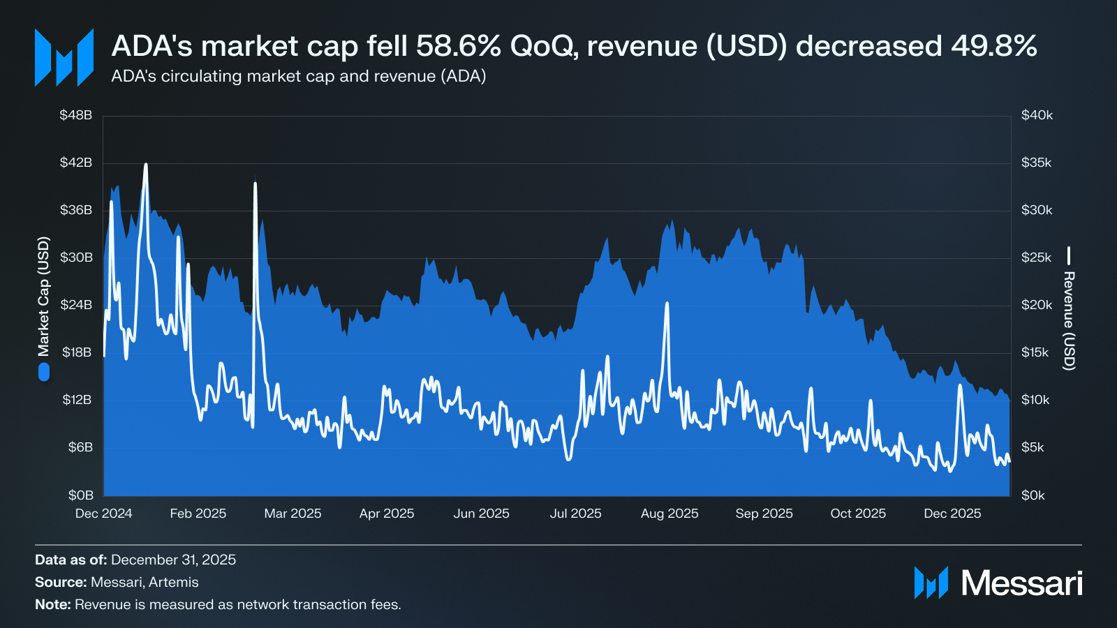ADA 가격은 전분기 대비 58.6% 하락하여 4분기 말 기준 0.33 달러를 기록했으며, 유통 시가총액은 295억 달러에서 122억 달러로 감소했다. 분기 말 기준 ADA의 유통 시가총액 순위는 11위로, 전분기 말 10위에서 한 단계 하락했다.