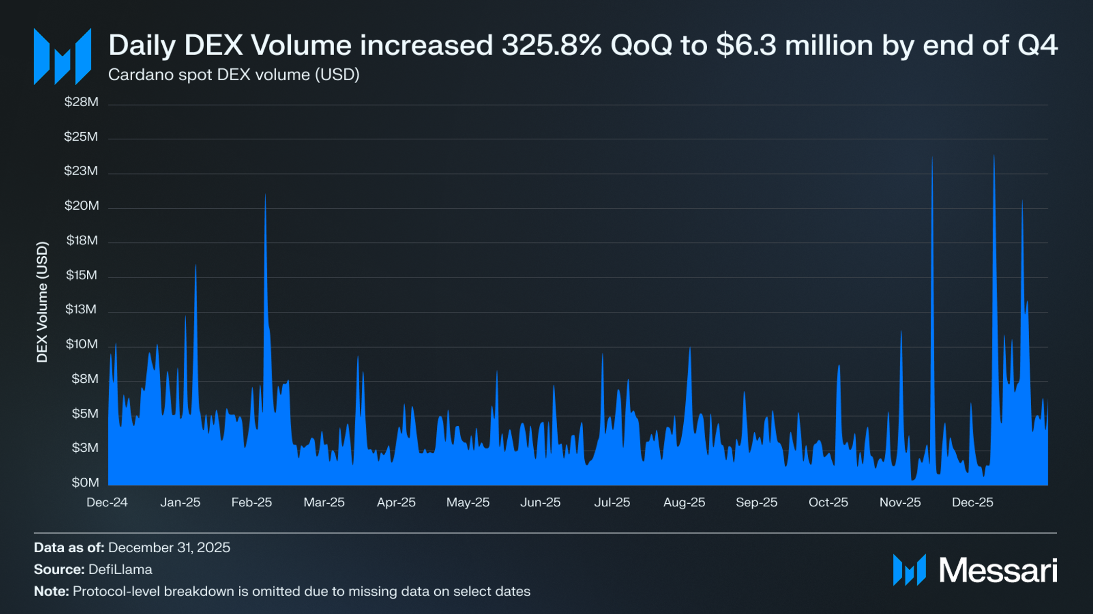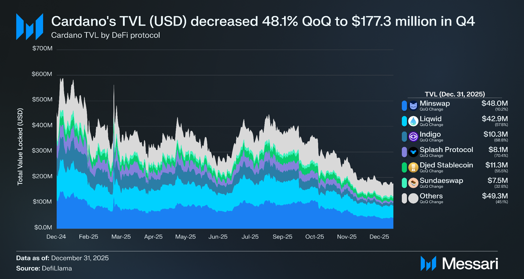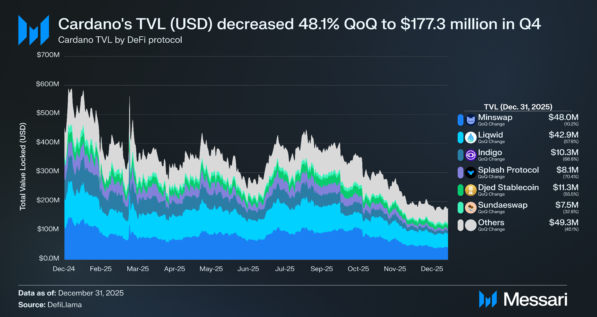 • NFT 일평균 거래량은 전분기 대비 133.4% 급증했으며, DEX 일평균 거래량은 17.3% 증가한 440만 달러를 기록했다. 민스왑(Minswap)은 네트워크 전체 거래량의 72.4%를 차지하며 지배적인 DEX 지위를 유지하고 있다.