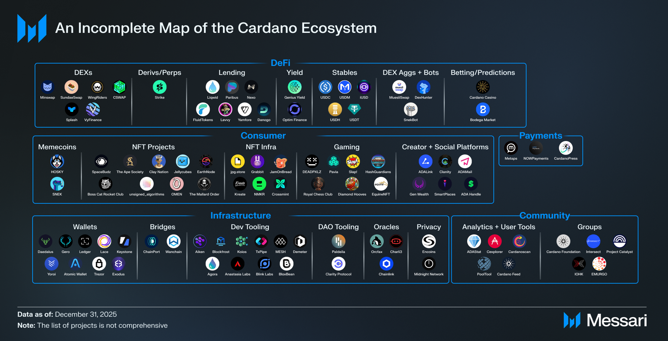 • 모네타(Moneta)의 USDM은 2024년 3월 16일에 출시되었다. USDA와 마찬가지로 USDM은 미국 달러 및 달러 동등물과 1:1로 담보된다. 4분기에 모네타의 사업 개발 책임자가 어돕션(Adoption) DRep으로 선출되어 탈중앙화 의사결정에서 스테이블코인 이해관계를 대변할 수 있는 권한을 부여받았다. 분기 내내 모네타는 유럽에서의 MiCA 준수 인프라 최종 구축에 집중했으며, 규제를 받는 노르웨이 파트너사인 NBX(NBX) 덕분에 USDM을 유럽 기관 사용 사례에 최적화된 카르다노 스테이블코인으로 포지셔닝했다.