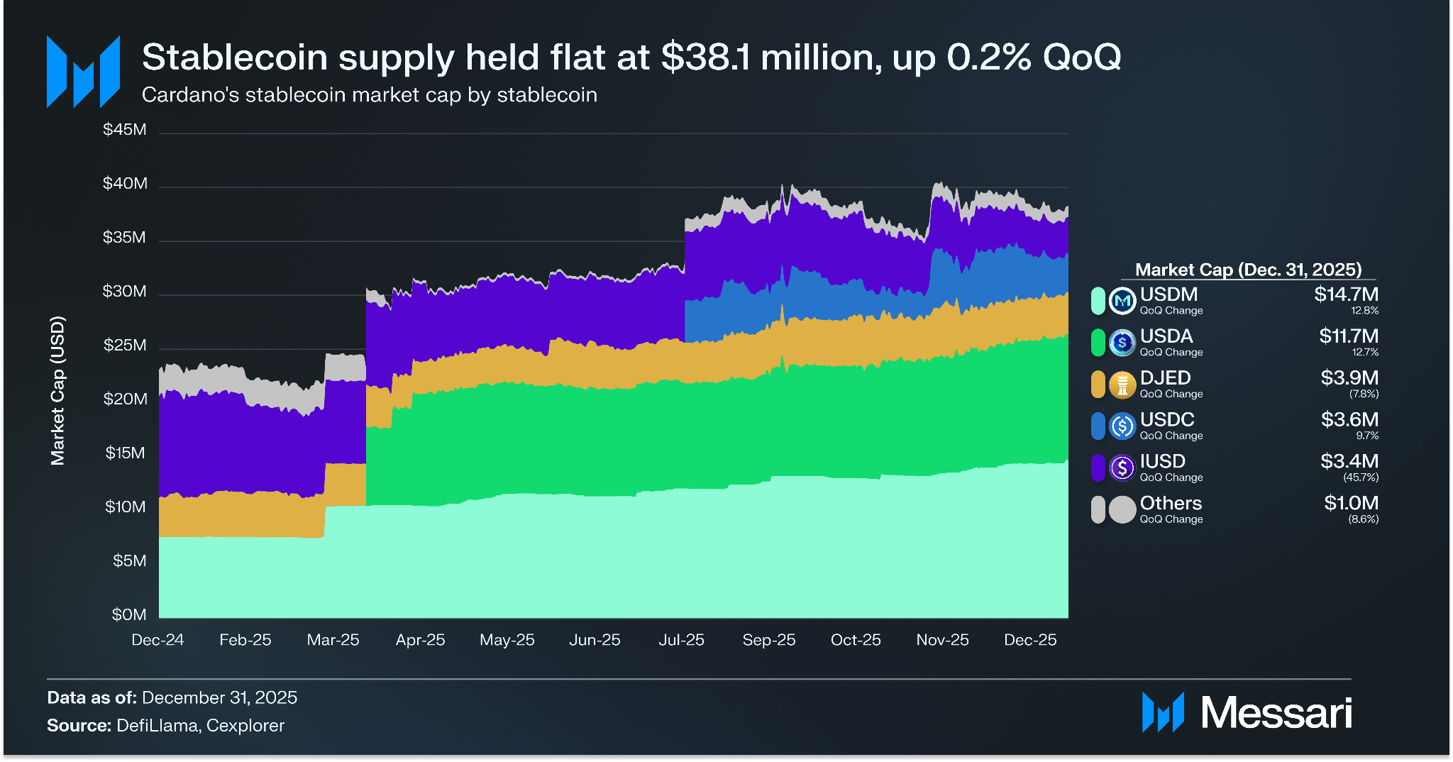카르다노의 스테이블코인 시가총액은 2025년 4분기에 사실상 보합세를 유지하며 전분기 대비 0.2% 증가한 3,810만 달러를 기록했다. USDM은 전분기 대비 12.8% 증가한 1,470만 달러로 시장 선두 지위를 공고히 했다. USDA는 전분기 대비 12.7% 증가한 1,170만 달러로 그 뒤를 바짝 추격했다. 반면 IUSD는 전분기 대비 45.7% 감소한 340만 달러를 기록했으며, DJED는 전분기 대비 7.8% 감소한 390만 달러를 기록했다. USDC는 전분기 대비 9.7% 증가한 360만 달러를 기록하며 성장세를 이어갔다.