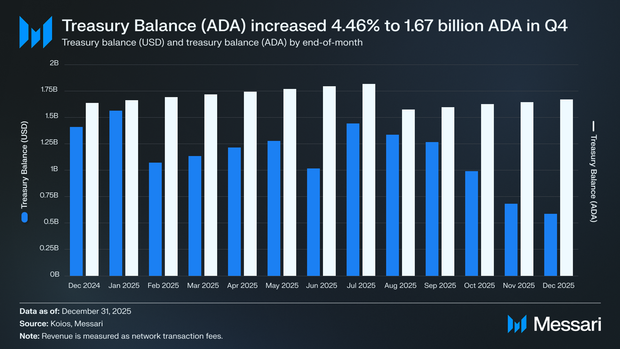카르다노의 트레저리 잔액(ADA)은 전분기 대비 4.46% 증가한 16억 7,000만 ADA를 기록했으며, 전년 대비로는 1.9% 증가했다. 달러 환산 가치는 전분기 대비 53.7% 감소한 5억 8,590만 달러로, 전년 대비 58.4% 하락했다. 트레저리는 카르다노의 유지 및 개발 자금을 제공하며, 2025년 1월 29일 플로민(Plomin) 하드포크 이후 커뮤니티 거버넌스를 통해 자원이 집행된다. 현재 카르다노 트랜잭션 수수료의 20%가 트레저리에 적립되며, 이 비율은 거버넌스를 통해 조정할 수 있다.