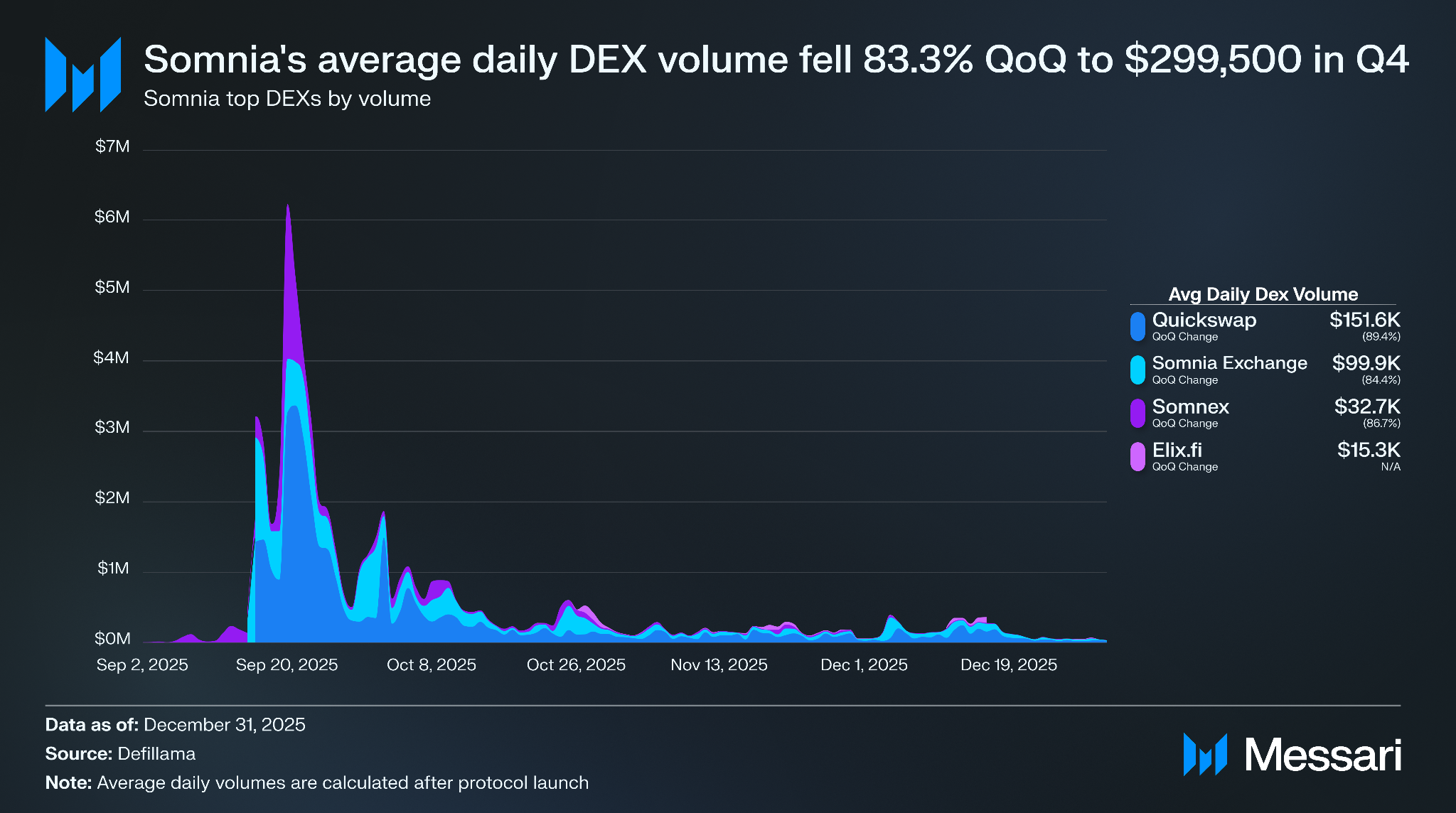 • DEX 활동은 메인넷 출시 직후 고점에서 정상화되어 일평균 거래량이 전분기 대비 87.1% 감소한 29만 9,500 달러를 기록했다. 절대 거래량은 감소했으나 주요 거래소 간 시장 점유율이 안정세를 보였으며, 엘릭스(Elix)와 같은 신규 진입자가 솜니아의 시장 구조를 확대했다.