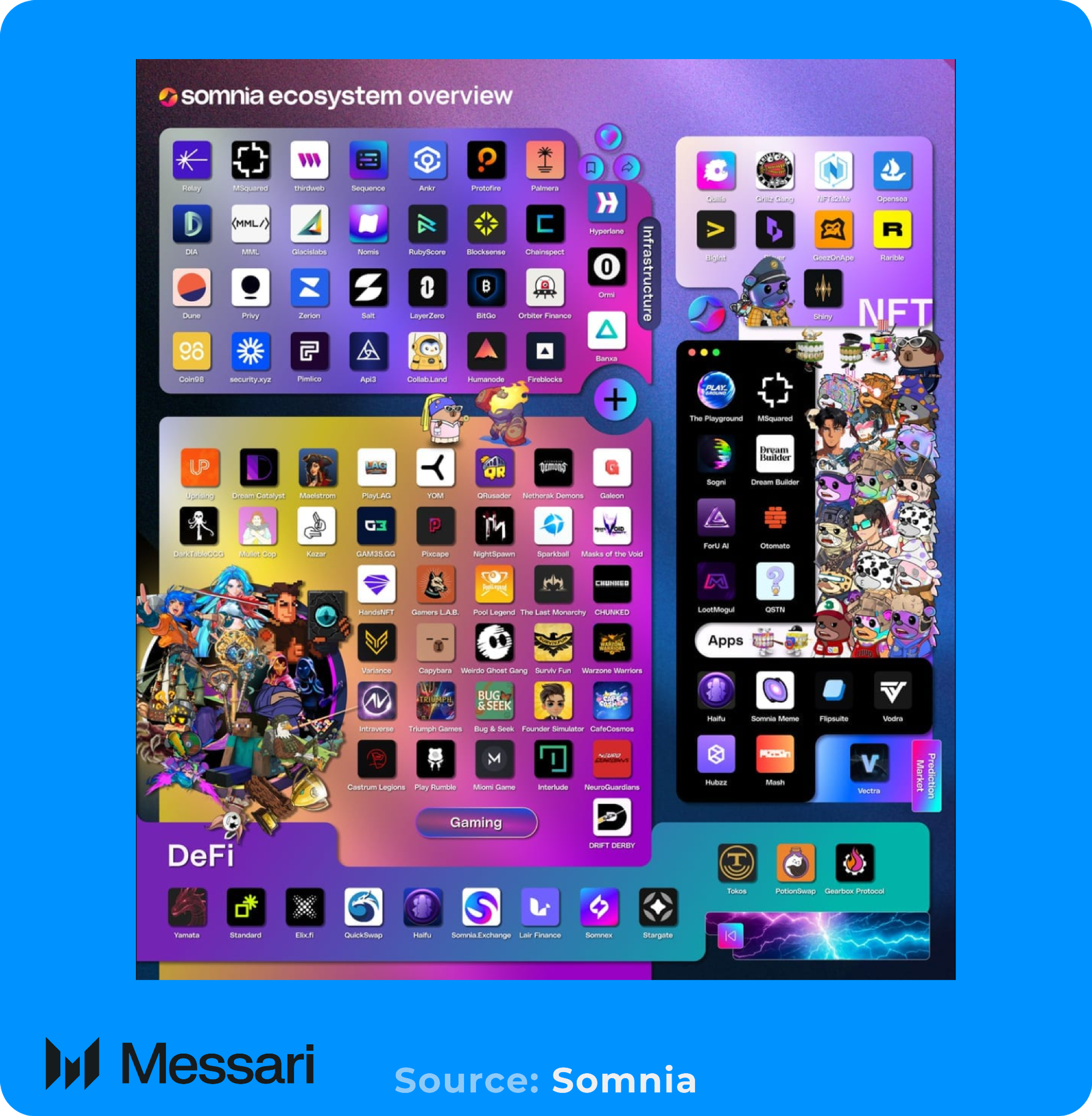 솜니아의 생태계는 상호운용성과 접근성을 중심으로 구축되었다. 구글 클라우드(Google Cloud), 빗고(BitGo), 파이어블록스(Fireblocks), 반자(Banxa) 등 인프라 파트너와 연계되어 있으며, 레이어제로(LayerZero)를 통해 외부 블록체인과 연결된다. 듄 애널리틱스(Dune Analytics)와의 파트너십은 데이터 가시성을 높이며, 오픈씨(OpenSea) 및 라리블(Rarible)과의 통합은 NFT 유동성과 크리에이터 온보딩을 지원한다.