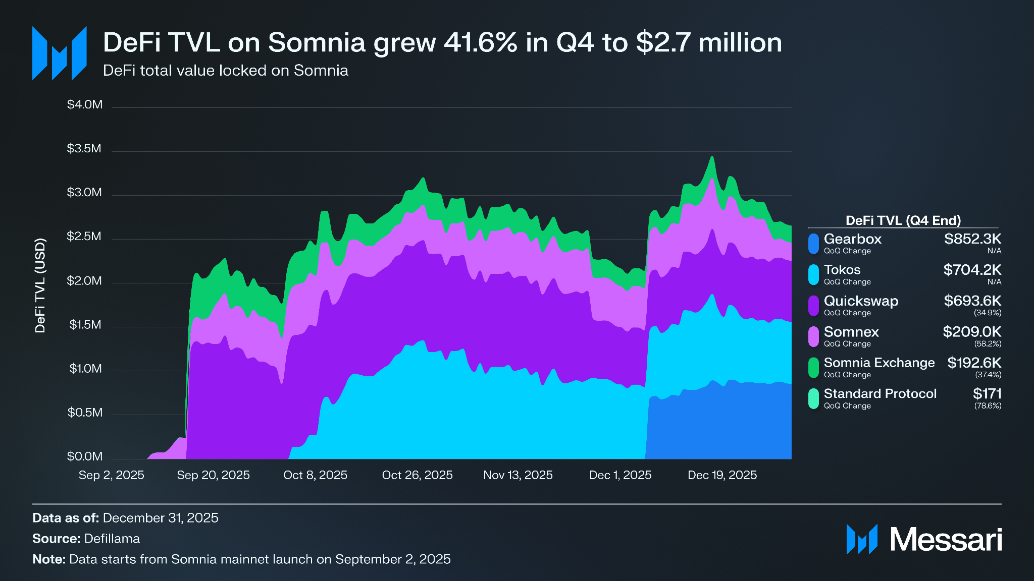 2025년 4분기 말 기준 솜니아의 DeFi TVL은 270만 달러로, 3분기 말 190만 달러 대비 41.6% 증가했다. TVL 기준 최대 프로토콜인 기어박스는 분기 말 기준 85만 2,300 달러를 보유하며 전체 DeFi TVL의 32.1%를 차지했다. 기어박스의 성장은 12월 2일 SOMI 및 USDC.e 대출 풀을 도입한 솜니아의 파트너십 발표 이후 이루어졌다. 기어박스의 모듈형 신용 인프라를 통합함으로써 솜니아는 자체 대출 개발 없이 네이티브 애플리케이션이 레버리지 전략을 지원할 수 있게 되었다. 이 출시는 신규 자본 유입을 촉진했으며, 대출을 솜니아 DeFi 스택의 새로운 핵심 축으로 자리매김했다.