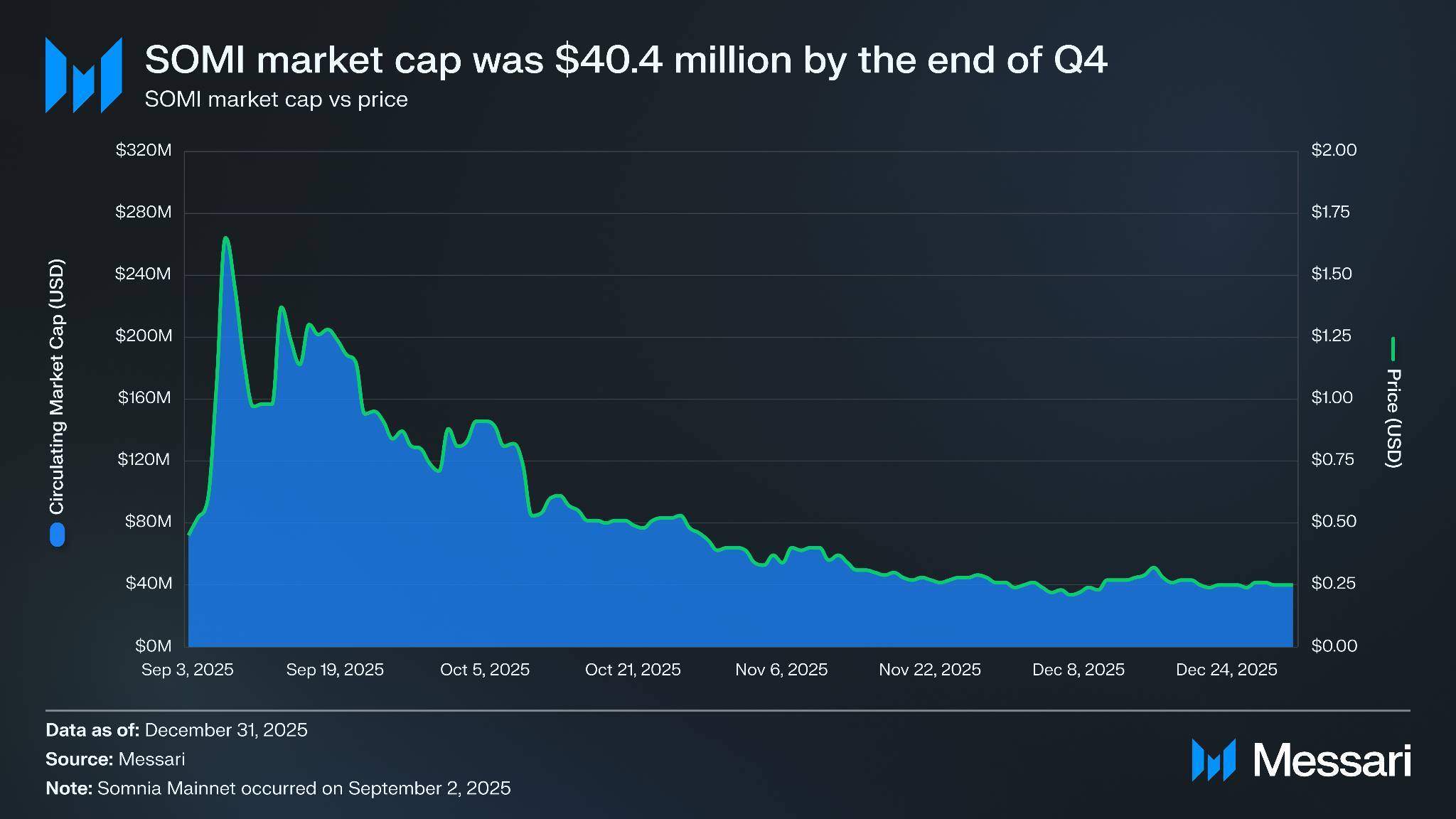 2025년 4분기 말 기준 SOMI의 시가총액은 4,040만 달러로, 3분기 말 1억 1,430만 달러 대비 64.7% 하락했다. 토큰 가격도 동반 하락하여 0.25 달러를 기록했으며, 이 역시 전분기 말 0.71 달러 대비 64.7% 하락한 수치다. 이 하락은 에어드롭 이후 매도세와 초기 참여자의 차익 실현에 기인하며, 투기적 관심이 식으면서 매도 압력이 증폭되었다.