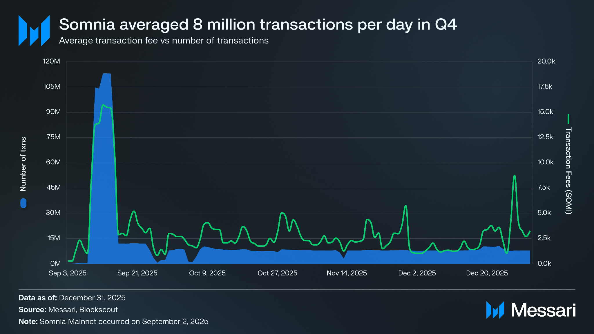 솜니아는 2025년 9월 메인넷 출시 이후 통합 단계를 거치며 4분기를 마무리했으며, 네트워크의 주요 사용 사례 정의에 실행 역량이 집중되었다. 에어드롭 분배 종료로 시장 활동이 냉각된 가운데에도 솜니아는 일평균 800만 건의 트랜잭션을 처리하며 대규모 의미 있는 처리량을 유지하고 지속적인 수수료를 창출했다.