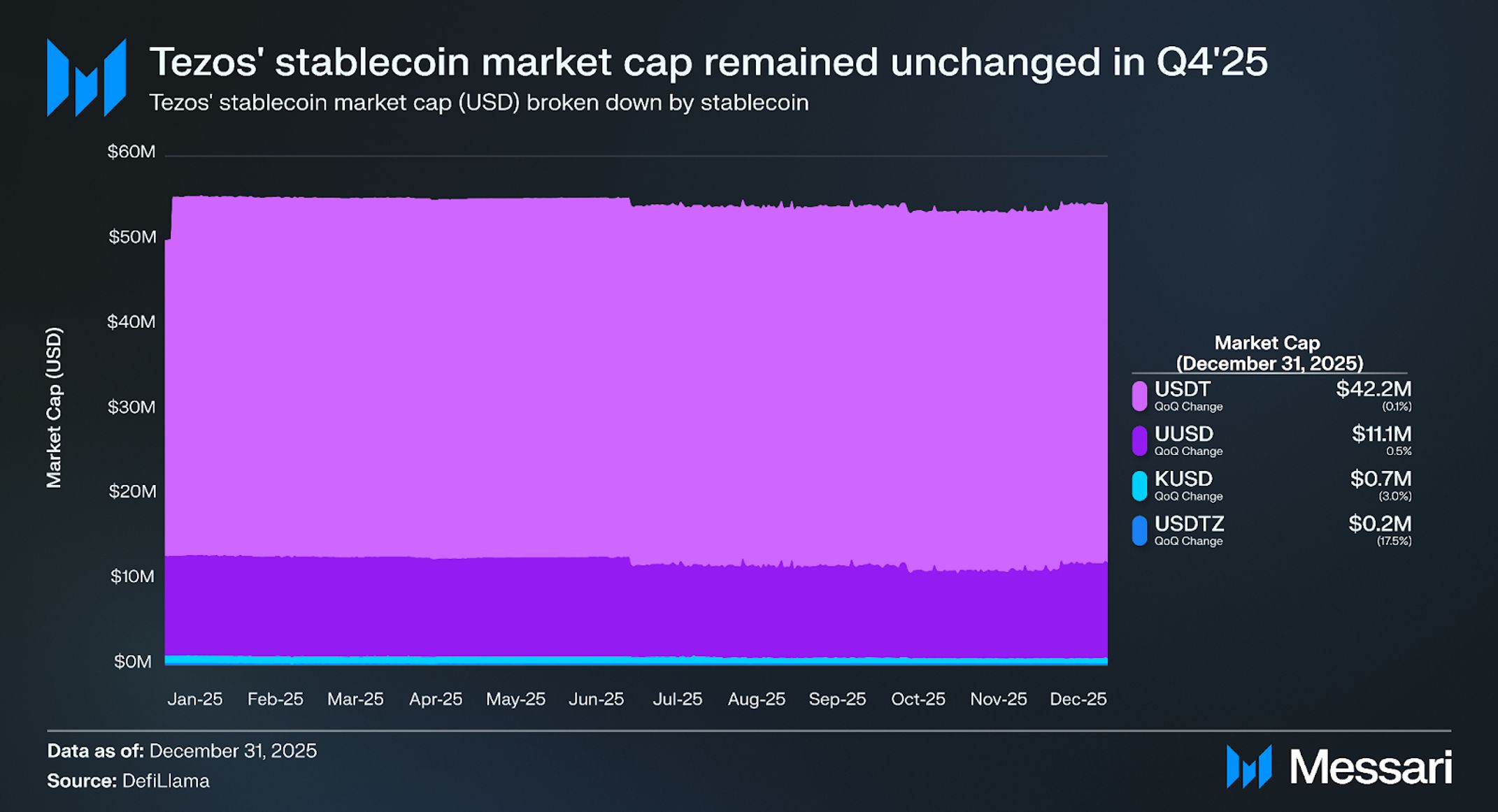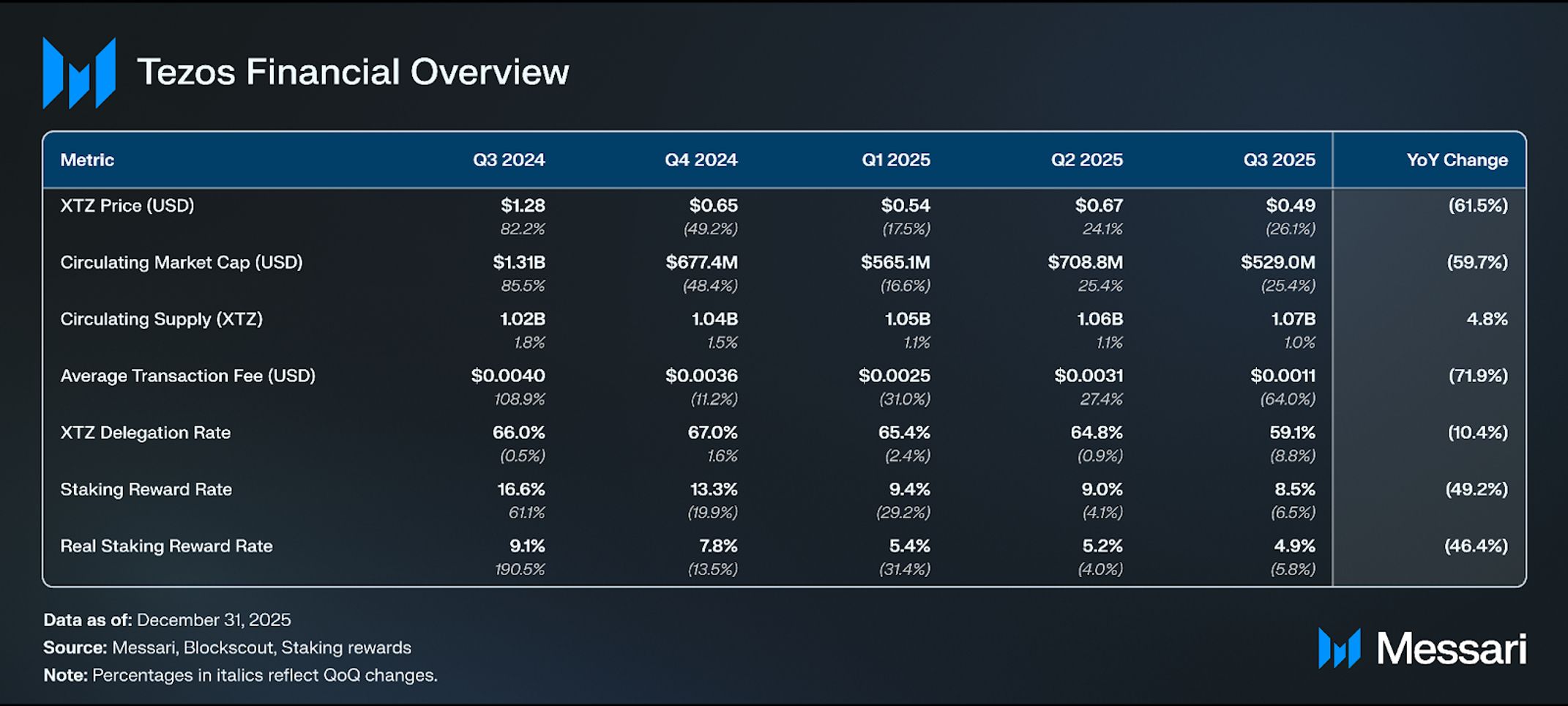2025년 12월 31일 기준 XTZ의 유통 공급량은 10억 7,000만 개였다. 2024년 4월 출시된 파리 업그레이드는 네트워크 보안을 인센티브화하면서도 인플레이션을 최소화하도록 설계된 적응형 발행 메커니즘을 도입했다. 스테이킹 목표치는 전체 XTZ 공급량의 50%이며, 이 메커니즘은 최소한의 XTZ 발행으로 해당 목표를 달성하기 위해 스테이킹 보상을 동적으로 조정한다. 목적은 XTZ 희석 최소화, 유동성 개선, 비효율 제거, 실제 사용 사례를 위한 XTZ 최적화다. 네트워크에서 스테이킹된 XTZ 총량은 3분기의 6억 8,810만 개에서 4분기 말 6억 3,310만 개로 8.1% 감소했다.