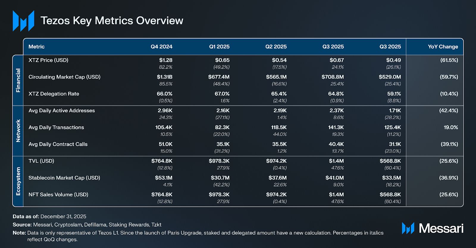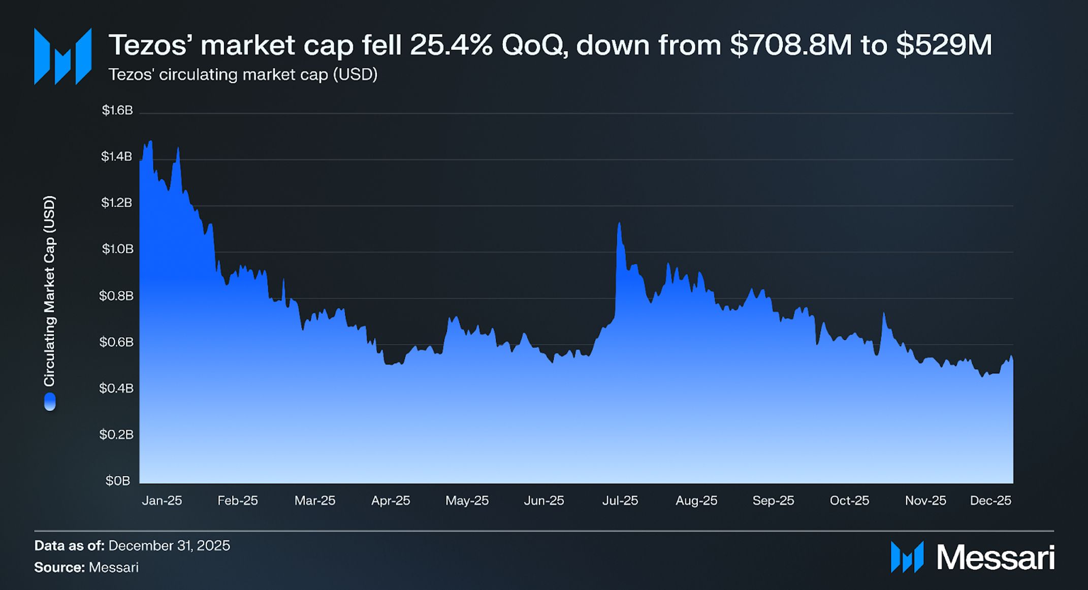 테즈(XTZ)는 테조스 블록체인의 네이티브 토큰으로, (i) 스테이킹, 위임 및 거버넌스에 사용되며 (ii) 테조스 레이어 1(L1)과 EVM 호환 레이어 2(L2) 네트워크인 이더링크 양쪽에서 트랜잭션 수수료를 납부하는 주요 수단으로 활용된다. 2025년 4분기에 XTZ 가격은 전 분기 대비 26.1% 하락하여 0.67달러에서 0.49달러로 내렸으며, 유통 시가총액(USD)은 전 분기 대비 25.4% 감소한 5억 2,900만 달러를 기록했다. 소폭의 차이는 XTZ 유통 공급량이 프로토콜의 인플레이션 일정에 따라 전 분기 대비 1.0% 증가한 10억 7,000만 XTZ로 늘어났기 때문이다. XTZ의 유통 시가총액 순위는 2025년 3분기 98위에서 2025년 4분기 80위로 상승했으며, 이는 XTZ가 시장 전반의 하락 장세에서 다른 자산 대비 상대적으로 선방했음을 시사한다.