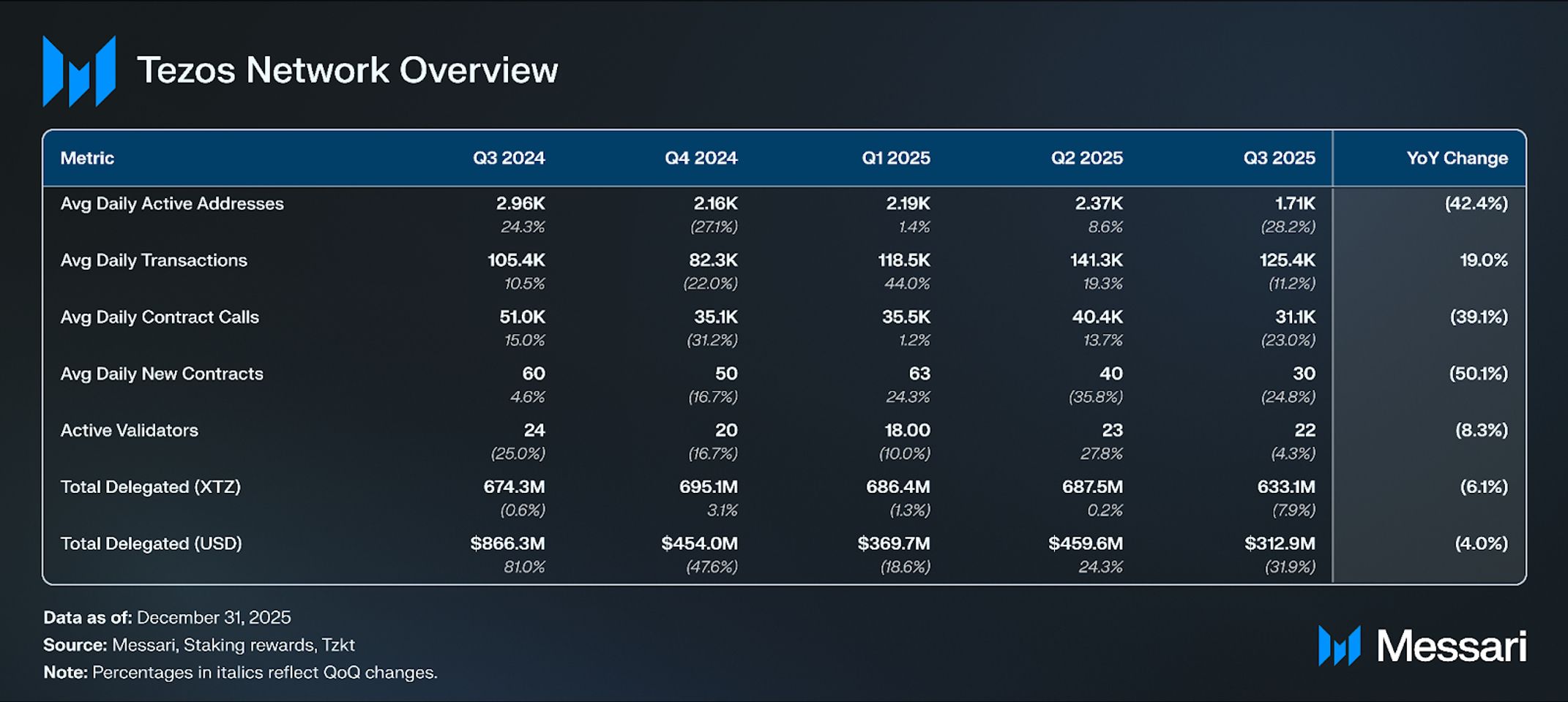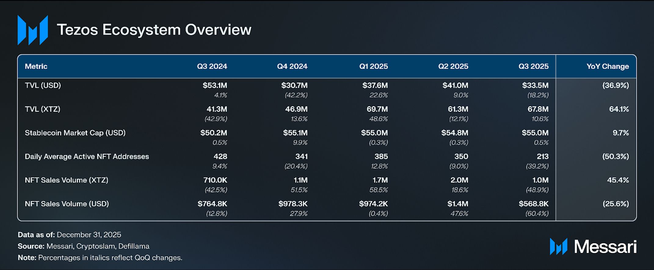 인프라는 이번 분기의 핵심 하이라이트였다. 2025년 10월의 에비수와 12월의 파르파데 두 차례의 커널 업그레이드는 이더링크의 처리량을 초당 800만 가스에서 2,700만 가스로 높이고 즉각적인 트랜잭션 확정 기능을 도입했다. 테조스 L1에서는 탈린 업그레이드가 연말 직전에 프로모션 기간에 진입하여 블록 타임 단축, 주소 인덱싱 및 강화된 최종성 보장을 도입할 예정이다. 개발자 활동도 확대되어 월간 활성 기여자 수가 전 분기 대비 16.2% 증가한 229명을 기록하고 4,300개 이상의 레포지토리에 걸쳐 활동했으며, 테조스 아트 커뮤니티는 '아트 온 테조스: 베를린', 아트버스와의 협업으로 진행된 파리 포토 부스, MoMI와 테조스 재단 파트너십 갱신을 통해 연중 가장 강세를 보인 분기를 마무리했다.