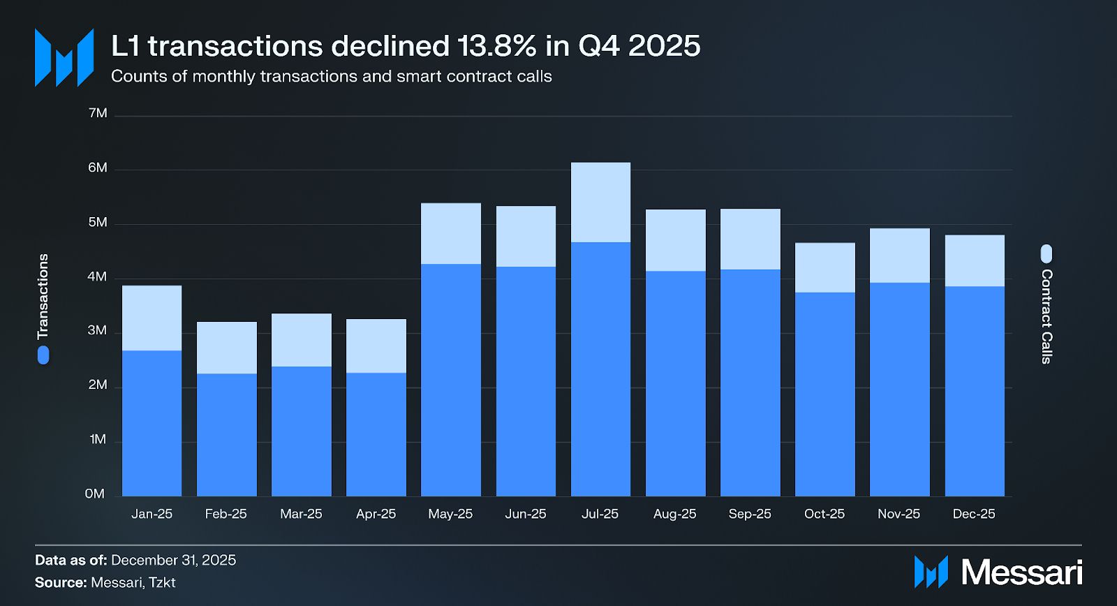 2025년 4분기 테조스 L1 트랜잭션은 전 분기 대비 11.2% 감소하여 평균 380만 건을 기록했으며, 이는 3분기의 480만 건에서 줄어든 수치다. 또한 컨트랙트 호출은 전 분기 대비 23% 감소하여 3분기의 120만 건에서 95만 3,270건으로 줄었다. 이러한 감소는 같은 기간 트랜잭션이 전 분기 대비 50% 증가한 이더링크로 L1 활동이 계속 이전되고 있음을 반영하는 것으로 보인다. 서울(Seoul) 업그레이드가 3분기 말에 활성화되었으며, 어테스테이션 및 언스테이킹 효율성 개선이 4분기에 반복적인 L1 운영 물량 감소에 기여했을 수 있다. 한편 탈린(Tallinn) 거버넌스 사이클은 2025년 11월과 12월에 투표 및 의결 트랜잭션을 발생시켰으나, 이더링크로의 활동 이동을 상쇄하기에는 역부족이었다.