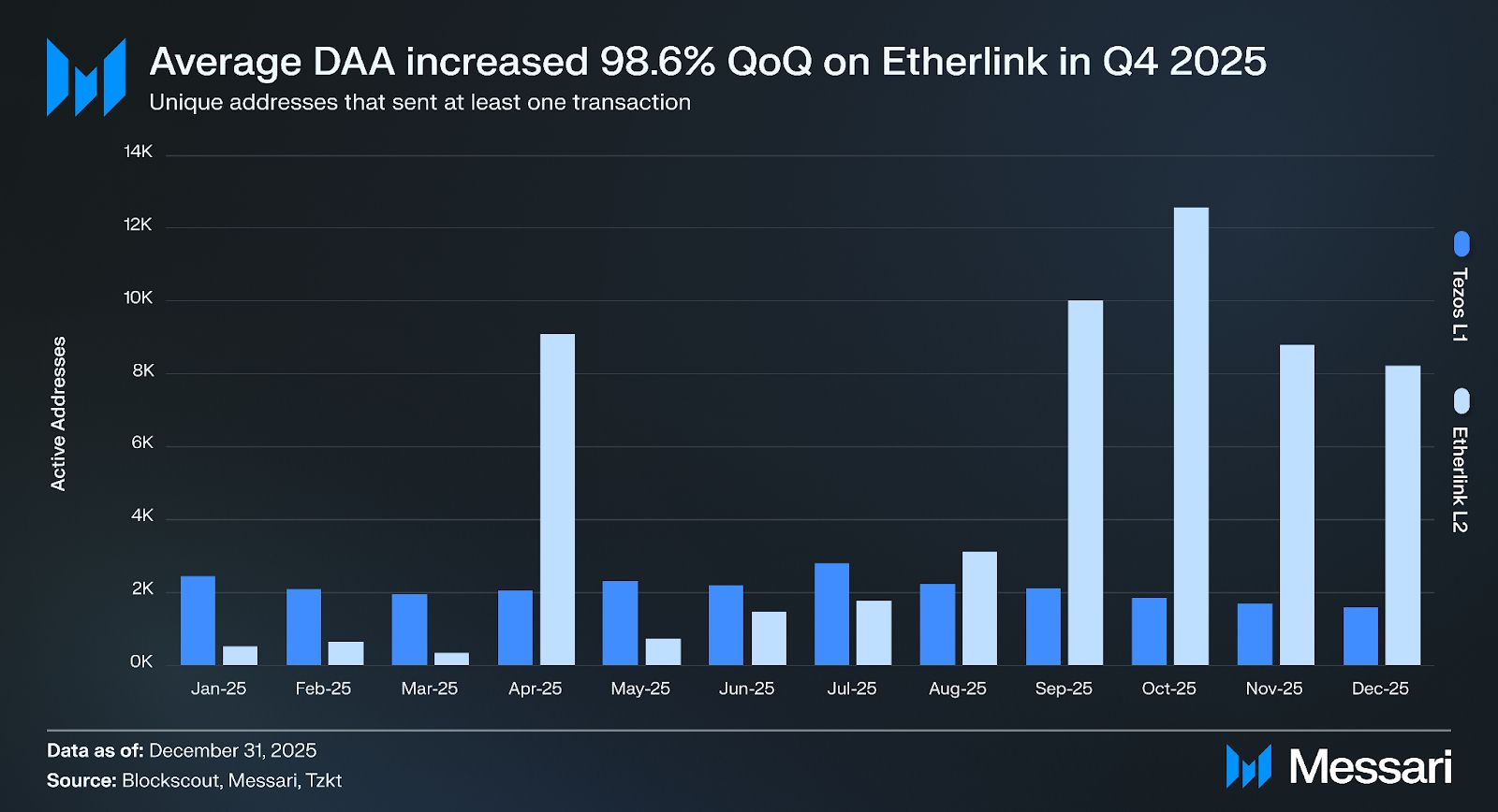 • 이더링크(Etherlink) 트랜잭션이 전 분기 대비 50% 증가한 1,860만 건을 기록했으며, 일일 활성 주소 수는 9,860개로 거의 두 배 증가하면서 이더링크가 테조스(Tezos) 생태계의 핵심 실행 레이어로 자리를 굳혔다.