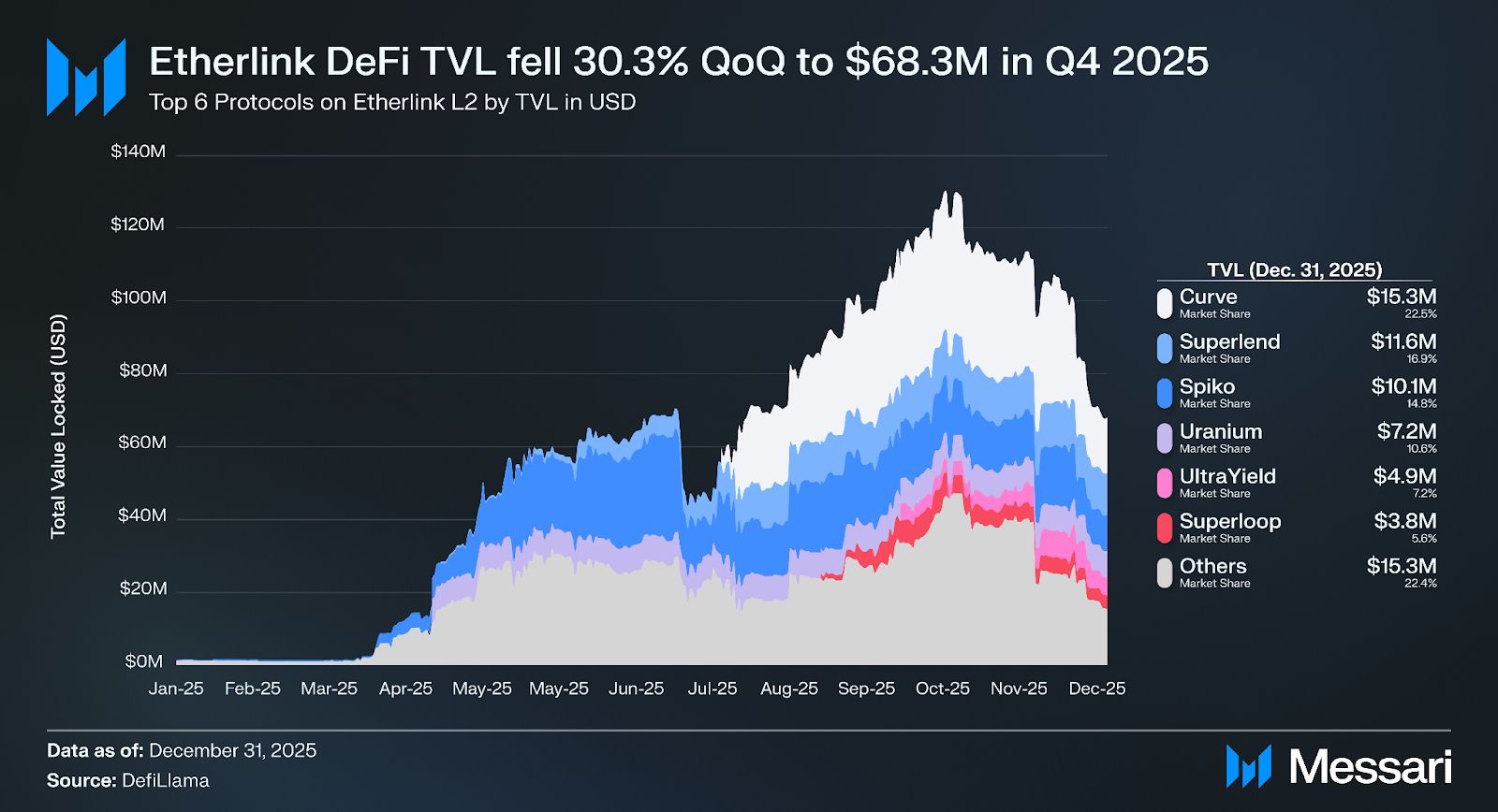 이더링크의 DeFi TVL은 전 분기 대비 30.3% 감소한 6,830만 달러를 기록했다. 이 하락은 주로 커브에 의해 주도되었으며, 커브는 4분기에 이더링크 생태계 TVL의 상당 부분을 잃었다. 이더링크 DeFi 생태계는 빠르게 테조스 L1과 이더링크 L2 전반에 걸쳐 DeFi 유동성의 주요 거점으로 자리 잡았다.