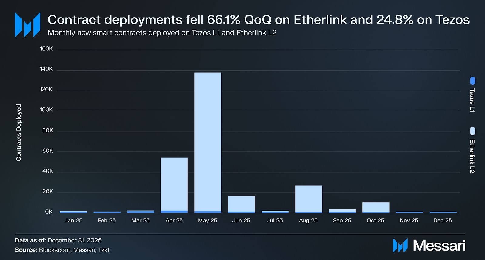 테조스 L1과 이더링크 L2 양쪽에서 컨트랙트 배포가 각각 24.8%, 66.1% QoQ 감소했음에도 불구하고, 4분기에는 두 네트워크 전반에 걸쳐 1만 2,000개 이상의 스마트 컨트랙트가 배포되었다. 3분기의 배포 급증은 애플 팜 시즌 2 론칭과 커널 4.1 툴링에 크게 영향을 받았으며, 이는 4분기 측정의 기준이 되는 비교 기준치를 높였다. 이더링크 배포는 9,760건으로 감소했으나, 울트라이일드(UltraYield)와 리퍼 액츄얼 등 여러 신규 프로토콜이 분기 중에 초기 컨트랙트를 배포했다. 테조스 L1에서는 탈린 업그레이드 제안이 주소 인덱싱 및 스토리지 비용에 대한 컨트랙트 수준의 변경 사항을 도입했으며, 이는 향후 배포 패턴에 영향을 미칠 수 있다. 이더링크의 분기별 컨트랙트 배포는 3분기의 2만 8,780건에서 66.1% QoQ 감소한 9,760건으로 줄었다. 테조스 L1 배포는 더 작은 폭인 24.8% QoQ 감소한 2,780건을 기록했다.