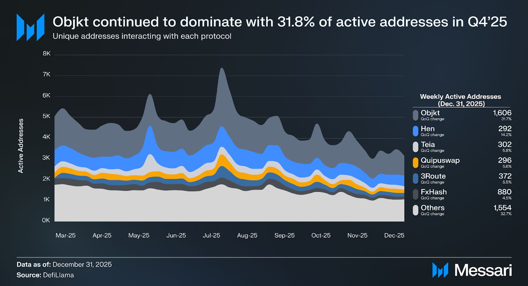 옵크트는 2025년 4분기에 주간 평균 1,170개의 활성 주소를 기록하며 고유 주소 활동 기준으로 테조스의 선도 마켓플레이스 위치를 유지했으나, 이는 전 분기의 1,570개 대비 25.3% QoQ 감소한 수치다. 옵크트는 네트워크 전반에서 가장 많은 활성 사용자 점유율을 유지하며 NFT 카테고리를 계속 지배했다. 옵크트랩스(Objktlabs)는 아티스트가 완전히 커스터마이징 가능한 랜딩 페이지로 블라인드 민트 드롭을 출시할 수 있는 드롭닷아트(drop.art)를 론칭했다. DeFi 카테고리에서는 퀴푸스왑과 쓰리루트(3route)가 유사한 감소를 경험했다. 퀴푸스왑은 주간 평균 사용자가 305명에서 207명으로, 쓰리루트는 317명에서 204명으로 감소했다. 수십 개의 소규모 또는 신흥 프로토콜을 포함하는 "기타" 카테고리는 주간 활성 주소가 1,560개에서 1,210개로 감소하여 애플리케이션 롱테일 전반에 걸친 유사한 참여 감소를 나타냈다.