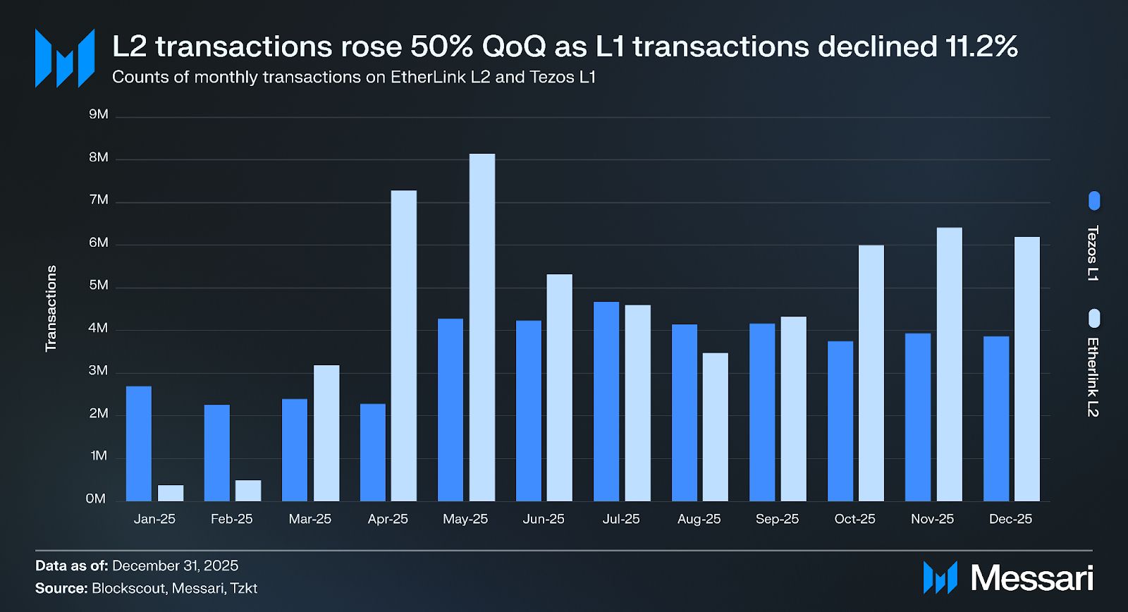 이더링크는 2025년 4분기에 1,860만 건의 트랜잭션을 처리하여 3분기의 1,240만 건 대비 50% 증가했다. 두 차례의 커널 업그레이드가 4분기 이더링크 성장의 상당 부분을 이끌었다. 2025년 10월 10일에 활성화된 에비수는 개발자들에게 더 넓은 EVM 호환성과 높은 처리량을 제공했다. 파르파데는 2025년 12월 17일에 이어 처리량을 초당 2,700만 가스로 끌어올리고 즉각적인 트랜잭션 확정을 가능하게 했다. 이 두 업그레이드를 통해 이더링크는 수수료를 높이지 않고도 더 많은 활동을 수용할 수 있었다. 애플 팜(Apple Farm) 시즌 2 인센티브는 4분기 대부분의 기간 동안 운영되어 사용자들이 커브, 슈퍼렌드(Superlend) 등 통합 프로토콜에서 보상을 파밍하면서 DeFi 관련 트랜잭션을 높은 수준으로 유지했다. 또한 MEXC는 2025년 11월 5일에 이더링크에서 네이티브 XTZ 입금을 지원하기 시작하여 또 하나의 온램프를 추가했으며, 이는 트랜잭션 볼륨 증가에 기여한 것으로 보인다.