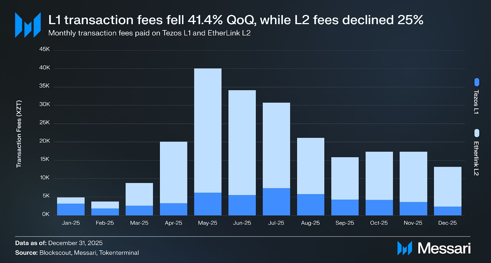 2025년 4분기에 테조스 L1 총 수수료는 전 분기 대비 41.4% 감소한 1만 230 XTZ를 기록했으며, 이더링크 L2 수수료는 전 분기 대비 25% 감소한 3만 7,660 XTZ를 기록하는 데 그쳤다. L1 수수료 감소는 트랜잭션과 컨트랙트 호출이 모두 전 분기 대비 줄어들면서 온체인 활동이 감소한 것과 맞물렸다. 2025년 4분기에는 테조스 L1과 이더링크에서 다수의 거버넌스 투표가 진행되면서 투표 트랜잭션이 발생하여 분기 내내 활동을 지탱하는 데 기여했다. 그러나 이러한 거버넌스 관련 수수료만으로는 L1 사용량의 전반적인 감소를 상쇄하기에 충분하지 않았다.
