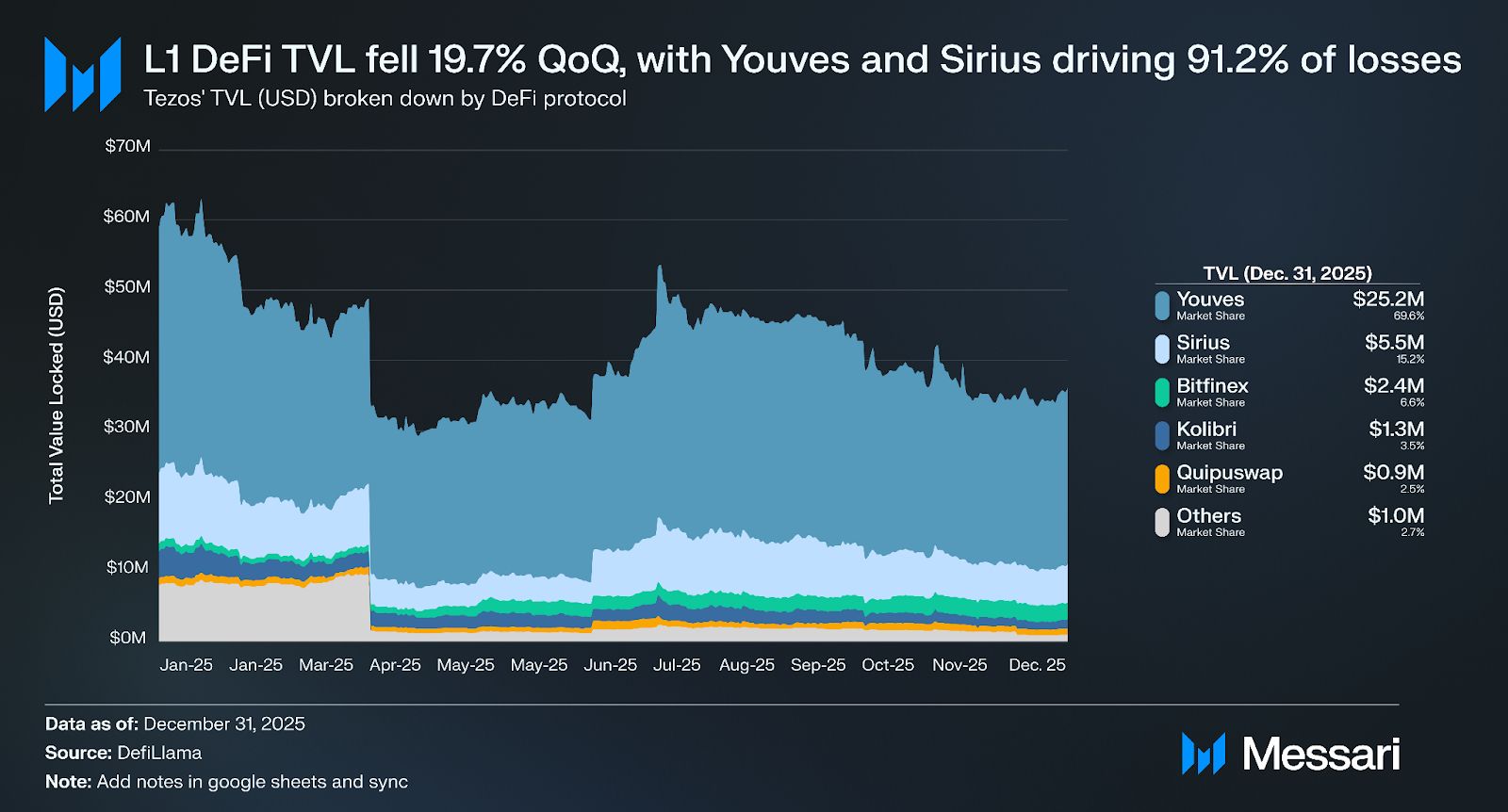 • 유브스: 테조스 L1의 온체인 트레저리 및 합성 자산 도구 모음. 유브스는 테조스 DeFi TVL 전반의 하락에 가장 크게 기여했다. TVL이 3,140만 달러에서 2,520만 달러로 19.8% 감소했으나, 유브스는 4분기에 TVL의 69.6%를 차지하며 지배적인 프로토콜 위치를 유지했다.