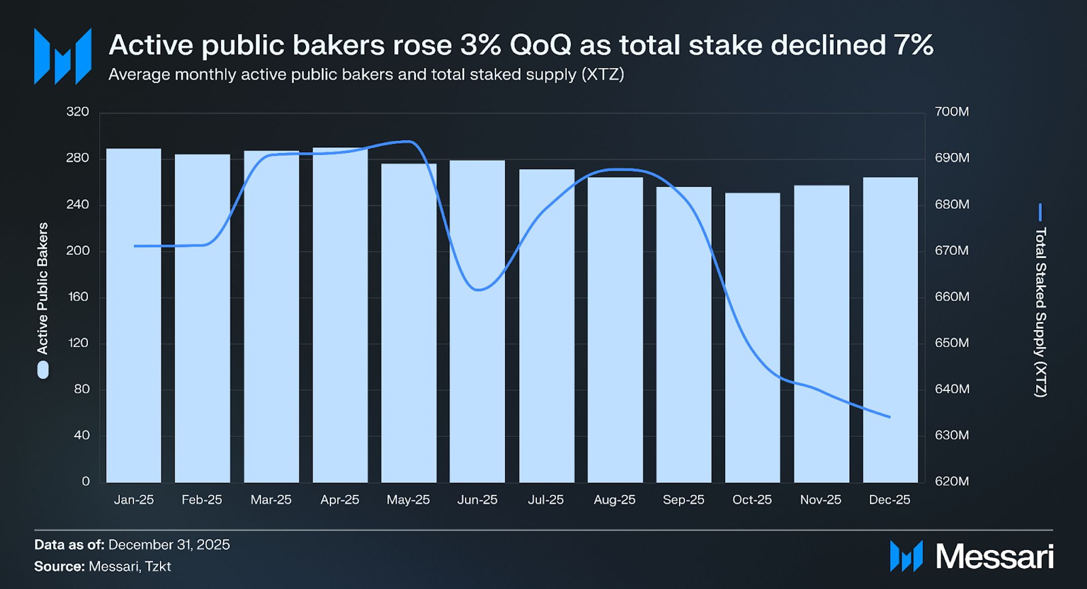 테조스는 유동형 지분증명(LPoS) 메커니즘을 사용하며, 이는 검증자(테조스 생태계에서 "베이커"라고 불림)와 위임자가 네트워크를 보안하기 위해 XTZ를 담보로 스테이킹하도록 요구한다. 트랜잭션에서 수집된 보상과 수수료는 네트워크를 유지하는 검증자와 위임자에게 지급된다. 2025년 4분기에 활성 공개 검증자 수는 전 분기 대비 3% 증가하여 2025년 9월의 256개에서 2025년 12월에는 264개로 늘었다. 공개 검증자는 전체 검증자 집합의 일부를 구성한다. 총 스테이크는 같은 기간 동안 6억 8,810만 XTZ에서 6억 3,310만 XTZ로 8.1% 감소했다. 스테이킹 참여의 지속적인 하락 추세에도 불구하고 전반적인 스테이킹 수준은 안정적으로 유지되고 있으며, 이는 참여자들 간에 지속적인 네트워크 보안과 경제적 정렬이 이루어지고 있음을 나타낸다.