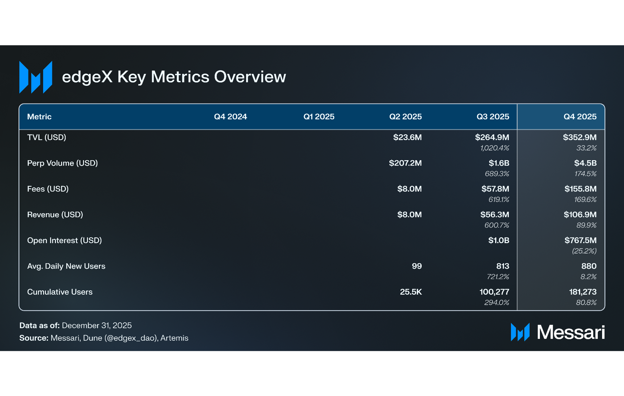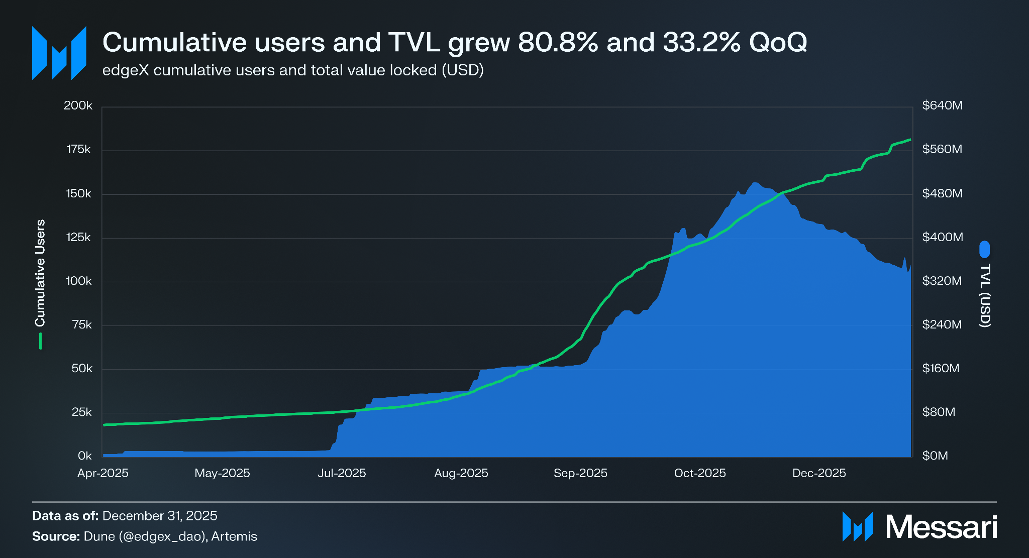 • 연말 기준으로 엣지엑스는 누적 사용자 18만 1,270명과 TVL 3억 5,290만 달러를 달성하여, 190억 달러 규모의 레버리지 포지션을 청산시킨 2025년 10월 10일 암호화폐 폭락 이후에도 지속적인 플랫폼 성장을 나타냈다.