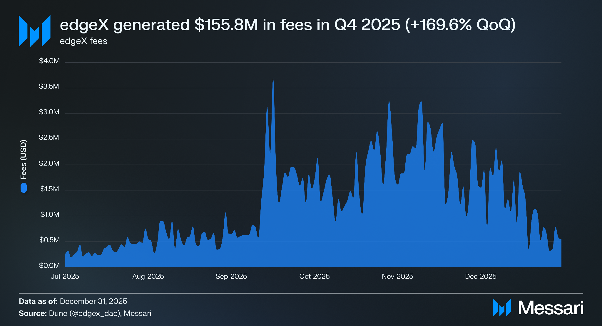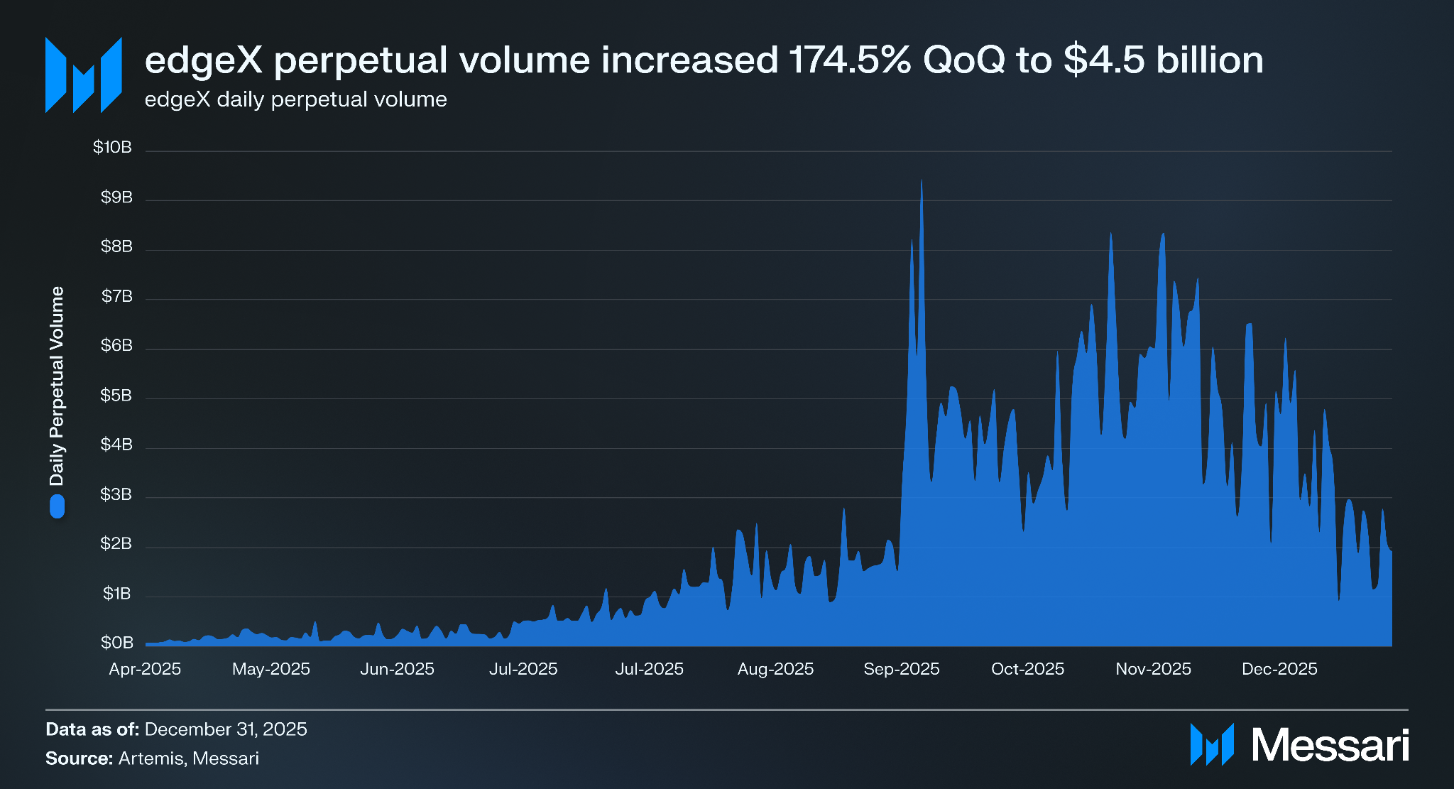 엣지엑스의 퍼페추얼 트레이딩 거래량은 2025년 4분기에 전 분기 대비 174.5% 증가하여 3분기의 16억 달러에서 45억 달러로 늘었으며, 일일 평균 거래량도 전 분기 대비 179.8% 증가한 4억 100만 달러를 기록했다. 거래량은 트레이딩 거래량 기준으로 엣지엑스 포인트의 60%를 배분했던 오픈 시즌 포인트 프로그램이 2025년 12월 3일에 종료된 이후 4분기 후반부에 감소했다.