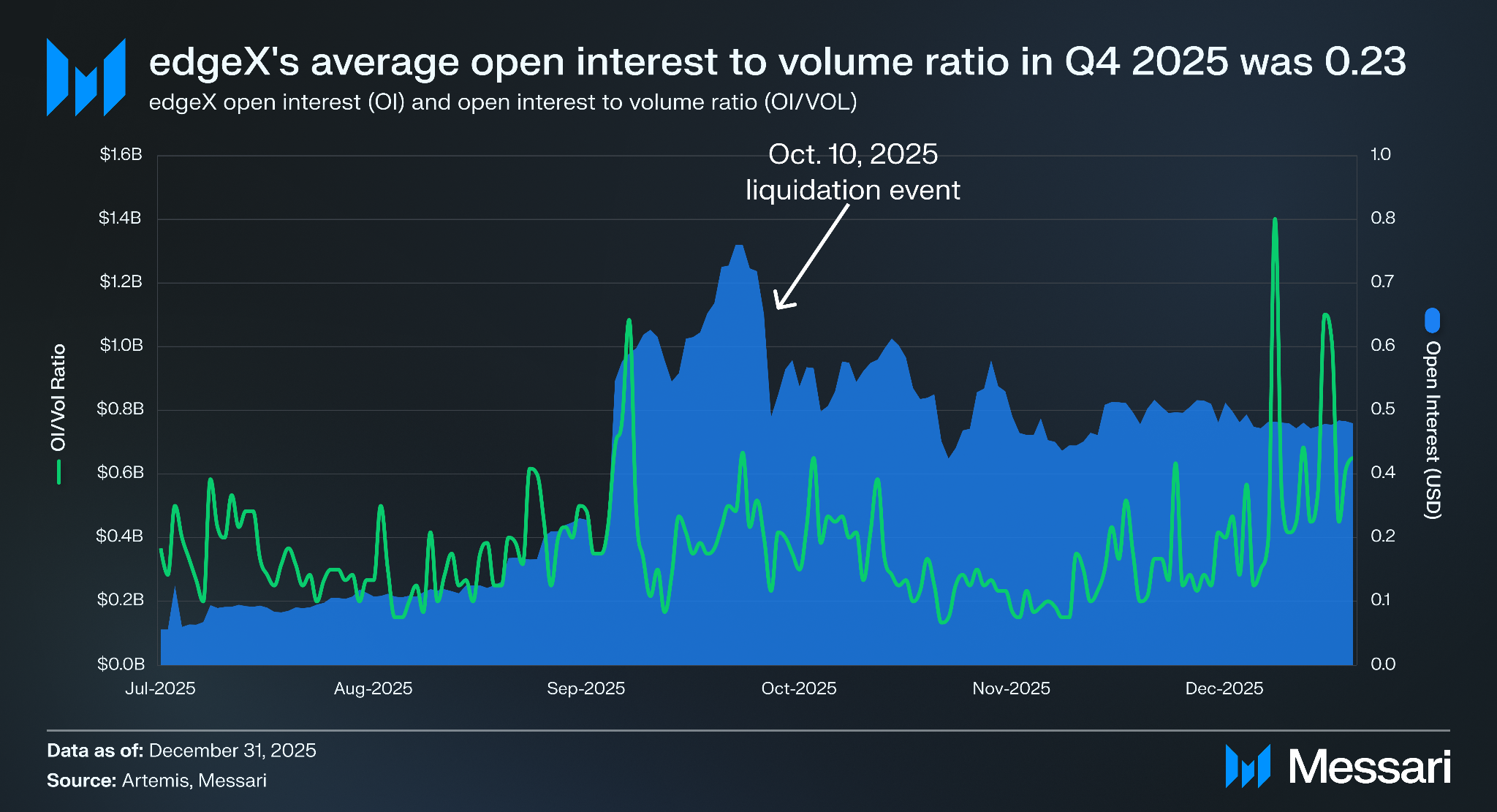 엣지엑스의 미결제약정(OI)은 2025년 9월 30일의 10억 달러에서 연말 7억 6,750만 달러로 전 분기 대비 31.2% 감소했다. OI는 2025년 10월 6일에 13억 달러로 정점을 찍었다가 2025년 10월 10일의 시장 변동성 이후 급격히 하락하여 29.2% 감소했으며, 이는 플랫폼 전반에 걸쳐 레버리지가 빠르게 해소되었음을 나타낸다. 2025년 10월 10일 이후 OI는 더 낮은 범위에서 안정화되어 2025년 11월 4일에 6억 4,860만 달러로 저점을 기록했으며, 2025년 12월 내내 7억 달러 중반대에서 유지되었다.