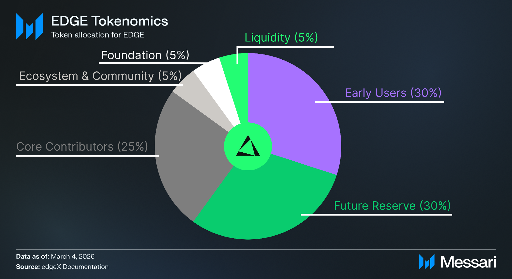 엣지엑스는 EDGE 토큰의 토큰 생성 이벤트(TGE)를 2026년 1분기 말로 목표로 하고 있다. EDGE는 총 공급량 10억 개로 고정되어 있으며, 다음과 같이 배분된다.