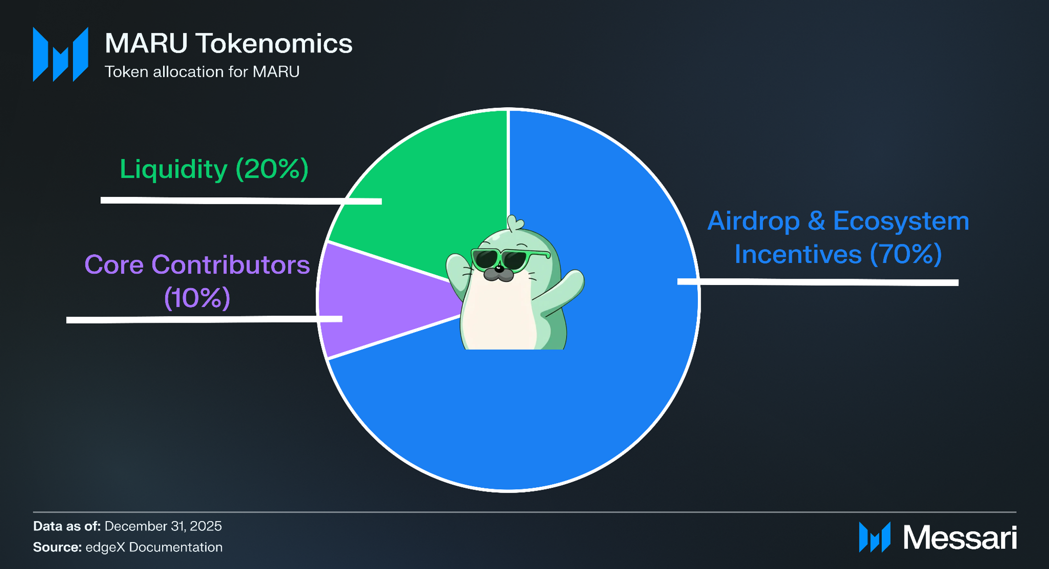 MARU는 "일반 트레이더"를 대표하도록 설계된 커뮤니티 밈코인으로 도입되었다. 이러한 포지셔닝은 토큰 설계와 배분 방식을 통해 강화되었다. MARU는 총 공급량이 100억 개로 고정되어 있으며, 다음과 같이 배분된다.