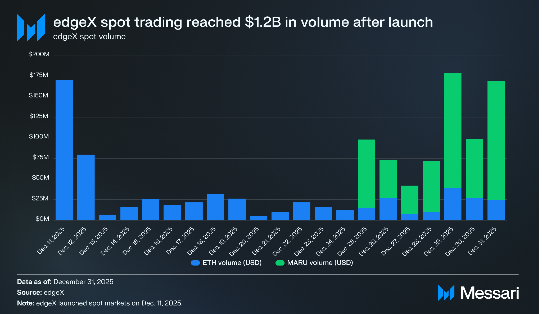엣지엑스는 2025년 12월 11일에 현물 시장을 출시하여 엣지 스택의 첫 번째 프로덕션 배포를 알렸다. 현물 거래는 연말까지 12억 달러의 누적 거래량을 달성했으며, 초기에는 ETH 시장이 주도했다가 12월 24일 엣지엑스 자체 밈코인인 MARU 출시 이후 MARU로 주도권이 이동했다. ETH 현물 거래량은 6억 950만 달러를 기록했으며, MARU는 연말 마지막 주만 거래되었음에도 불구하고 5억 8,210만 달러의 거래량을 창출했다.