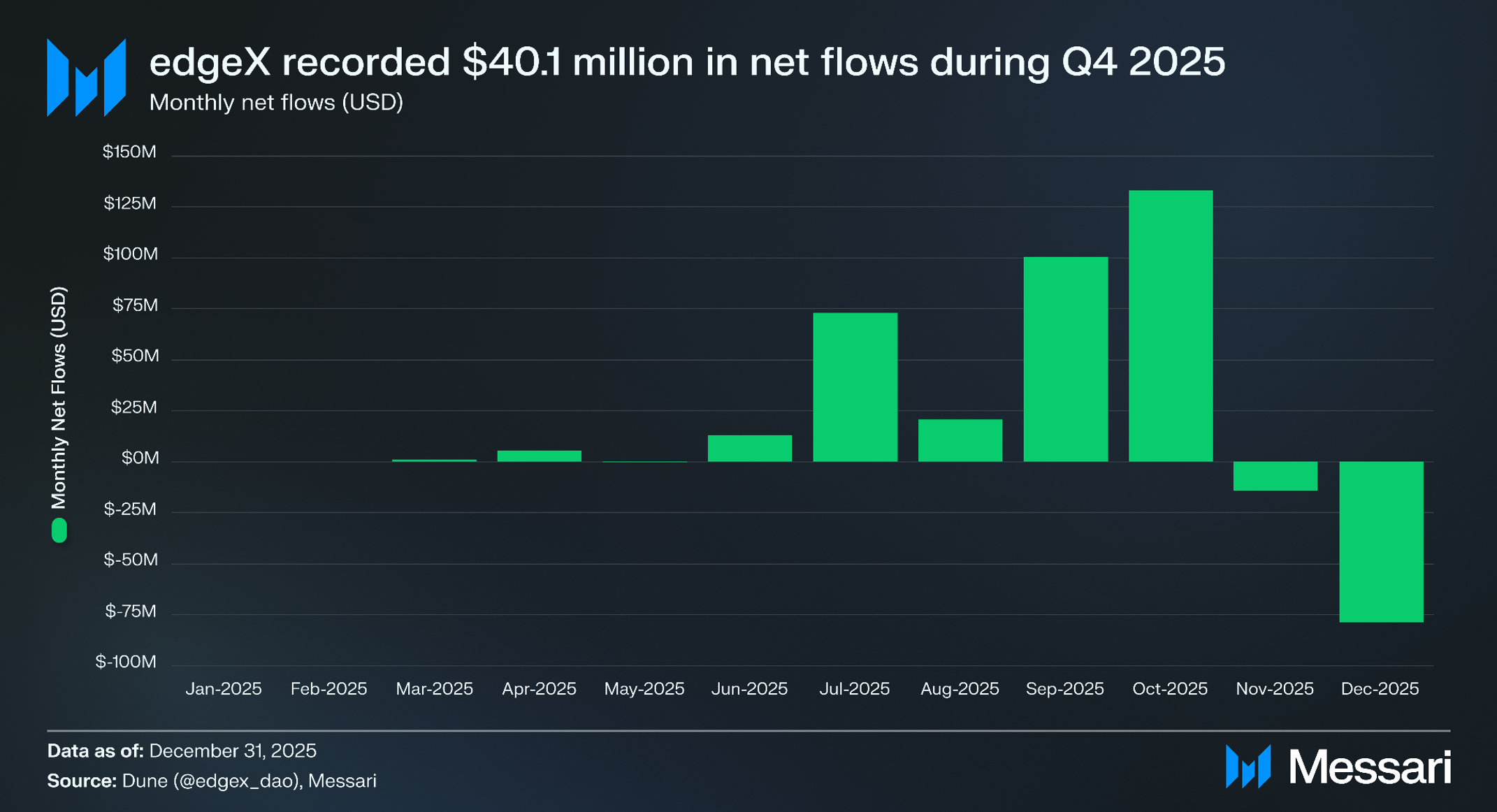 11월에는 1,400만 달러의 순 유출이 기록되었으며, 12월에는 2025년 12월 3일에 종료된 엣지엑스의 오픈 시즌(Open Season) 캠페인 종료로 인해 7,900만 달러의 순 인출이 발생했다.