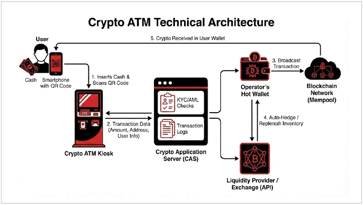 암호화폐 ATM의 기술적 인프라를 이해하는 것은 이러한 사기 수법의 지속성과 개입 가능한 지점을 평가하는 데 필수적입니다. 일반적으로 암호화폐 ATM이 디지털 자산을 보관한 독립형 자동판매기처럼 작동한다고 인식되지만, 실제로는 백엔드의 암호화 애플리케이션 서버(CAS, Crypto Application Server)에 연결된 프런트엔드 단말기로 운영됩니다. 사용자가 현금을 투입하고 QR 코드를 스캔하면, 키오스크가 직접 블록체인에 거래를 전송하는 것이 아니라 CAS에 신호를 보내 운영자의 중앙화된 핫월렛에서 목적지 주소로 자금을 전송하도록 합니다. 동시에 시스템은 Kraken이나 Coinbase와 같은 유동성 제공자 또는 거래소에 자동화된 API 호출을 실행하여 가격 변동 위험을 헤지하고, 운영자의 암호화폐 재고를 보충합니다.