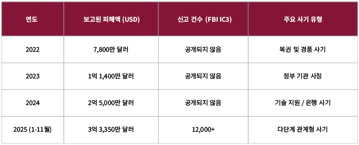 - FBI 인터넷 범죄 신고 센터 (IC3): 2022년부터 2025년 11월까지의 신고 건수 및 피해액 데이터