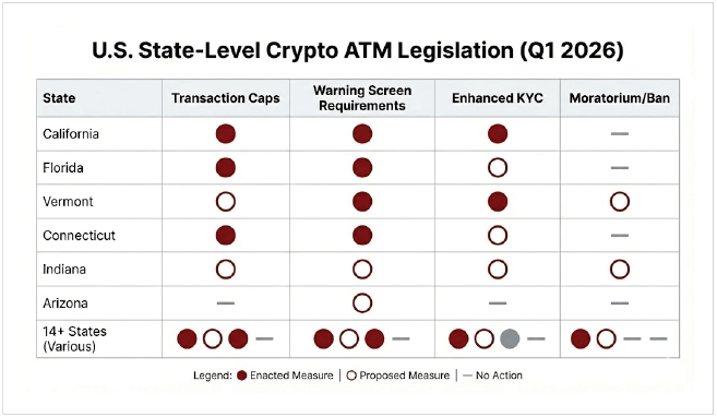 미국에는 연방 정부보다 주(州) 의회가 더 적극적으로 움직이고 있습니다. 2025년과 2026년 초 사이 최소 14개 주에서 암호화폐 ATM 관련 법안을 제정하거나 발의했습니다. 캘리포니아의 「디지털 금융자산법(Digital Financial Asset Law)」은 2024년 1월부터 시행되었으며, 개인당 일일 거래 한도를 1,000달러로 제한하고 500달러를 초과하는 거래에 대해 생체 기반 신원 확인을 요구합니다. 플로리다의 SB 505 법안은 건너뛸 수 없는 경고 화면 표시와 운영사가 유지하는 사기 신고 핫라인 설치를 의무화했습니다. 버몬트와 코네티컷은 포괄적인 규제 프레임워크가 마련될 때까지 신규 키오스크 설치를 일시 중단하는 모라토리엄을 추진했습니다. 또한 인디애나 주 의회는 HB 1116 법안을 추진했으며, 해당 법안은 주 전역에서 암호화폐 ATM 운영을 전면 금지하는 내용을 담고 있습니다. 현재 주별 규제 환경은 여전히 매우 파편화되어 있으며, 제한적인 규제를 실제로 시행한 주는 소수에 불과한 상황입니다.