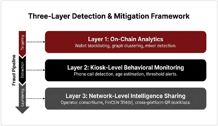 기술적 대응책은 크게 세 가지 계층에서 작동합니다: 온체인 분석, 키오스크 수준의 행동 모니터링, 그리고 네트워크 차원의 정보 공유 체계입니다.