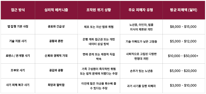 사회공학 공격의 핵심 방법론은 피해자의 인지 능력을 과부하 상태로 만들어 상황을 합리적으로 판단하는 능력을 약화시키는 것입니다. 공격자들은 사기 유형에 따라 강압적인 압박과 보호적 공감 사이를 오가도록 훈련되어 있습니다. 예를 들어 권위 기관 사칭 사기에서는 즉각적인 체포를 위협하면서 동시에 자신만이 피해자의 자산을 보호할 수 있는 유일한 사람이라는 점을 강조합니다. 반면 관계 기반 사기에서는 수주 또는 수개월에 걸쳐 감정적 조작이 점진적으로 진행된 뒤, 그 이후에 금전 탈취 단계가 시작됩니다.