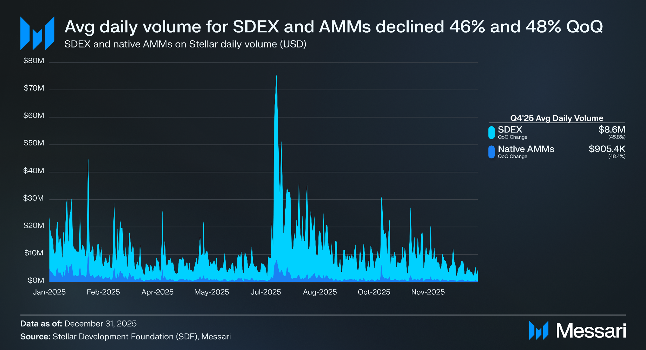 SDEX의 일평균 거래량(달러 기준)은 분기 대비 45.8% 감소하여 1,580만 달러에서 860만 달러로 줄어든 반면, 네이티브 AMM의 일평균 거래량은 분기 대비 48.4% 감소하여 180만 달러에서 90만 5,400 달러로 줄었다. 달러 기준 거래량 하락의 약 절반은 XLM 가격의 분기 대비 44.1% 하락에 기인하며, SDEX와 네이티브 AMM 모두에서 거래량의 약 절반이 XLM이기 때문이다. 나머지 하락은 스테이블코인을 중심으로 한 거래량 감소에 기인한다.