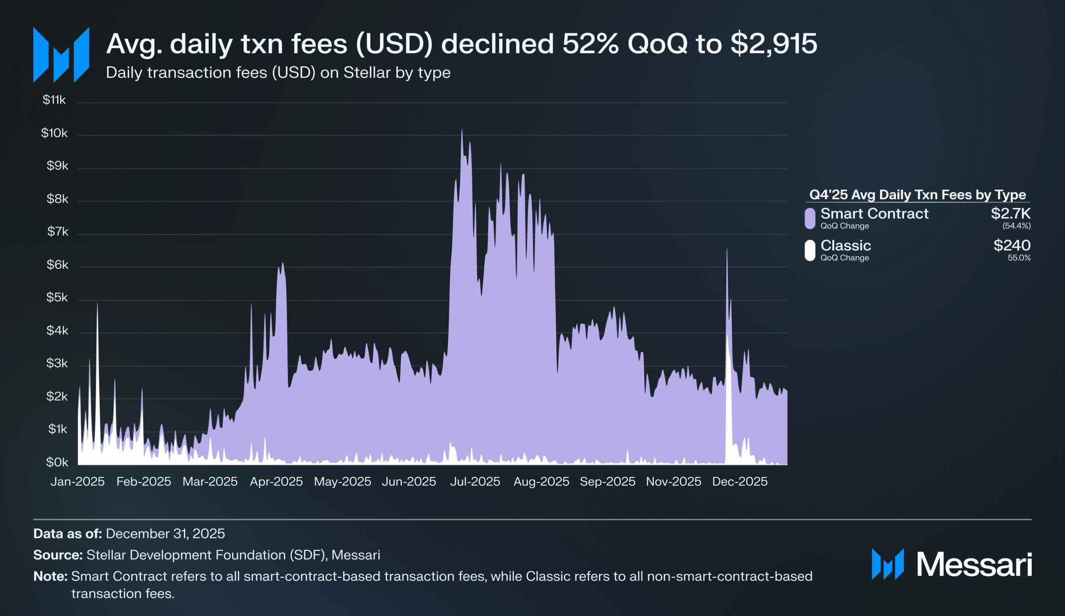 평균 트랜잭션 수수료는 분기 대비 54.7% 하락하여 0.0013 달러에서 0.0006 달러로 낮아졌다. 마찬가지로, 일평균 트랜잭션 수수료(달러 기준)는 분기 대비 52% 감소하여 2025년 3분기 6,020 달러에서 2025년 4분기 2,915 달러로 줄었다. 이 감소는 9월 프로토콜 23(휘스크) 업그레이드에 의해 주도됐으며, 향상된 웹어셈블리 캐싱과 읽기 작업을 위한 더 효율적인 메모리 사용을 통해 수수료를 인하했다. 또한, 스마트 컨트랙트 트랜잭션 수수료(소로반 수수료)는 네트워크가 성능을 조정하고 수수료를 낮출 수 있도록 하는 스텔라 리밋 프로포절(Stellar Limits Proposals, SLPs)을 통해 구성 가능하다. 네트워크 용량 증가는 네트워크가 서지 프라이싱(surge pricing)을 벗어나도록 유지하여 수수료를 낮춘다.