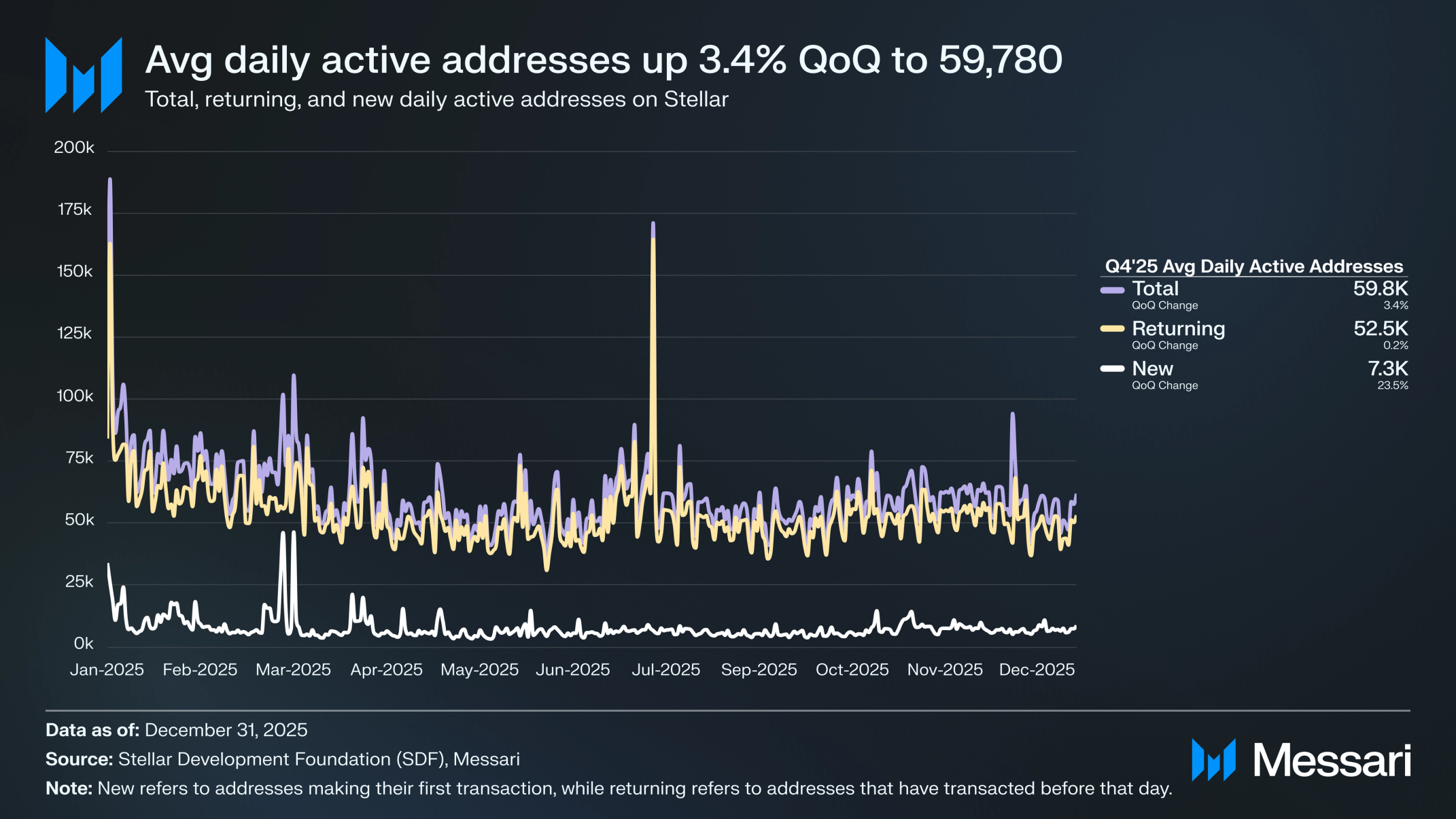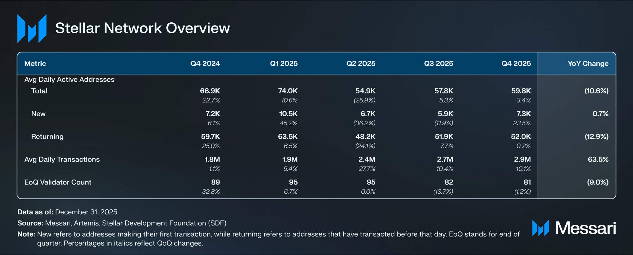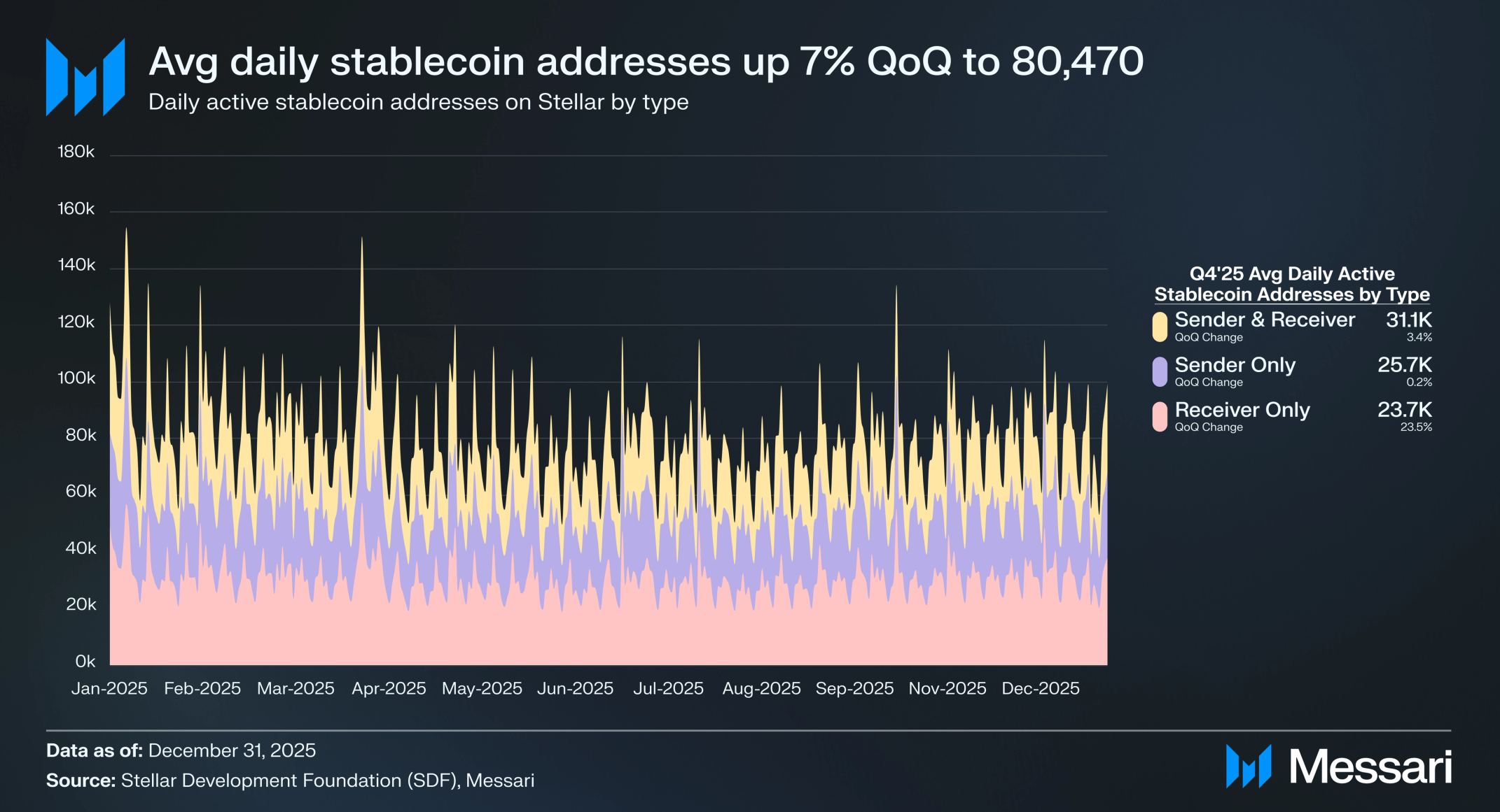 스텔라의 일평균 스테이블코인 주소는 분기 대비 7% 증가하여 7만 4,900개에서 8만 470개로 늘었다. 같은 날 스테이블코인을 전송하고 수신한 주소는 분기 대비 8% 증가하여 2만 8,820개에서 3만 1,090개로 늘었으며, 전송만 한 주소는 9% 증가하여 2만 3,060개에서 2만 5,710개로, 수신만 한 주소는 5.3% 증가하여 2만 2,480개에서 2만 3,680개로 늘었다. 이 지표는 스텔라의 표준 계정 주소인 G-주소(G-address)를 집계하며, C-주소(C-address)는 스마트 컨트랙트에 사용된다. 이 두 가지가 네트워크의 두 가지 주요 주소 유형이다.