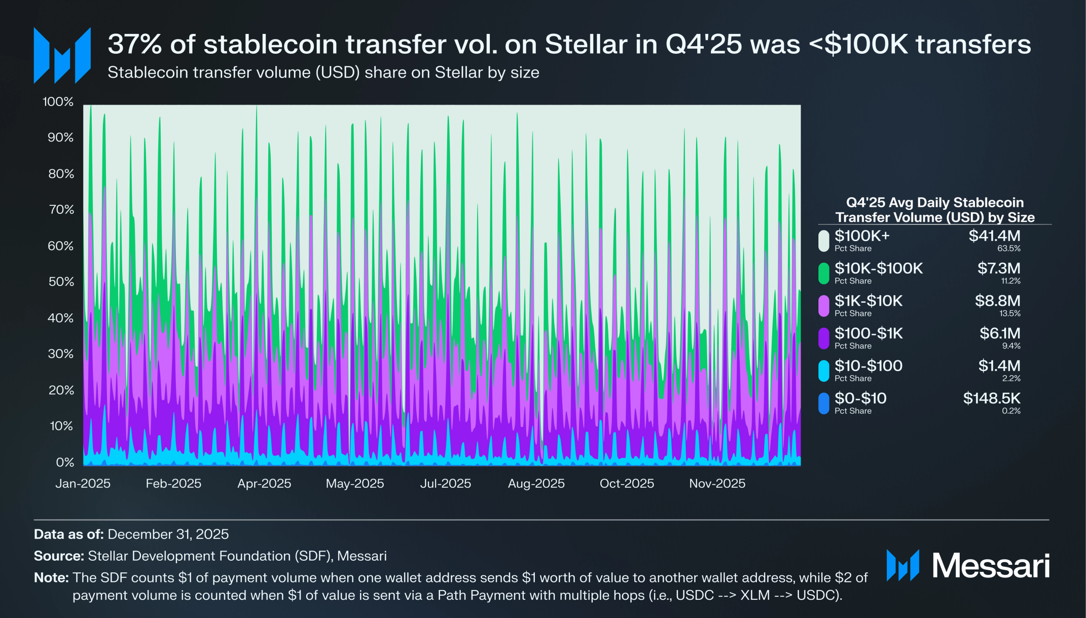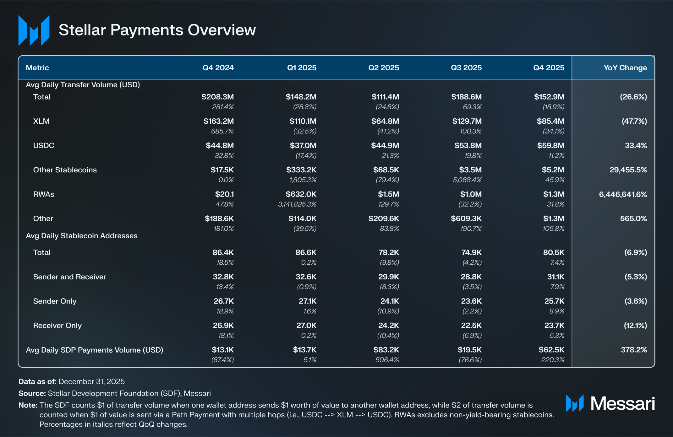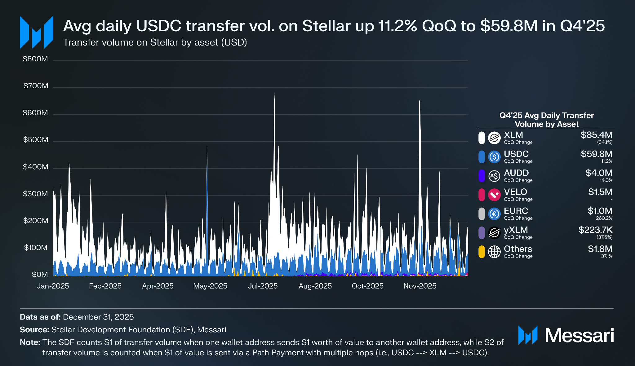 2025년 4분기, 스텔라 네트워크의 평균 트랜잭션 수수료는 0.00061 달러로 결제에서 네트워크의 저렴한 비용을 잘 보여준다. SDF는 한 지갑 주소가 다른 지갑 주소로 1 달러 상당의 가치를 전송할 때 1 달러의 결제 거래량으로 계산하며, 여러 홉을 거치는 패스 페이먼트(예: USDC → XLM → USDC)를 통해 1 달러의 가치가 전송될 때는 2 달러의 결제 거래량으로 계산한다. 메사리는 이 활동을 이전 거래량(transfer volume)으로 집계한다.