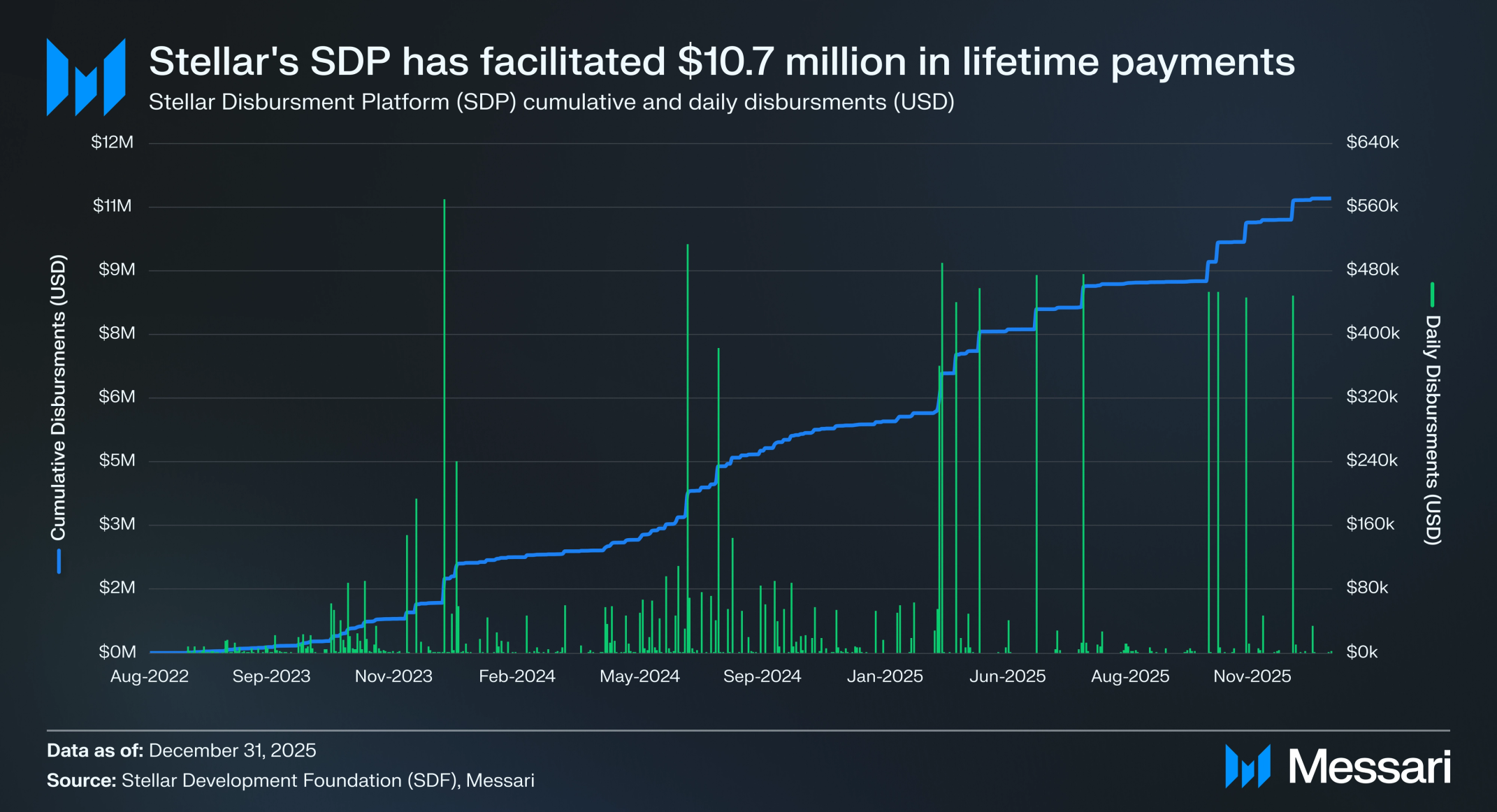 4분기에는 스텔라에서 여러 결제 이정표가 달성됐다. 그중 가장 주목할 만한 것은 2025년 12월 마셜 군도(Marshall Islands)가 스텔라의 토큰화 채권(USDM1)을 이용해 온체인 보편적 기본소득을 지급한 것이다. 이는 국가 정부의 최초 온체인 보편적 기본소득 지급이다. 이 이니셔티브는 ENRA 프로그램의 일환으로, 흩어진 섬 전역의 시민들에게 현금 직접 전달을 디지털 이전으로 대체한다.